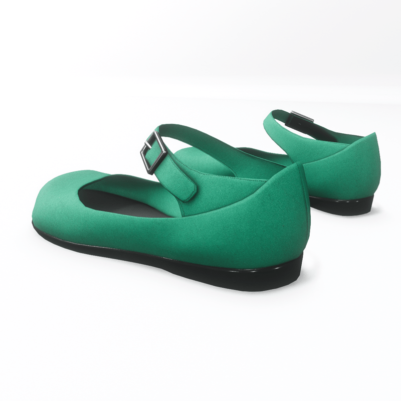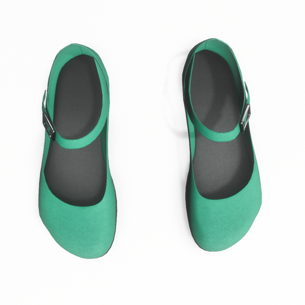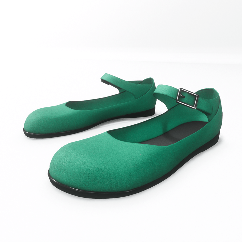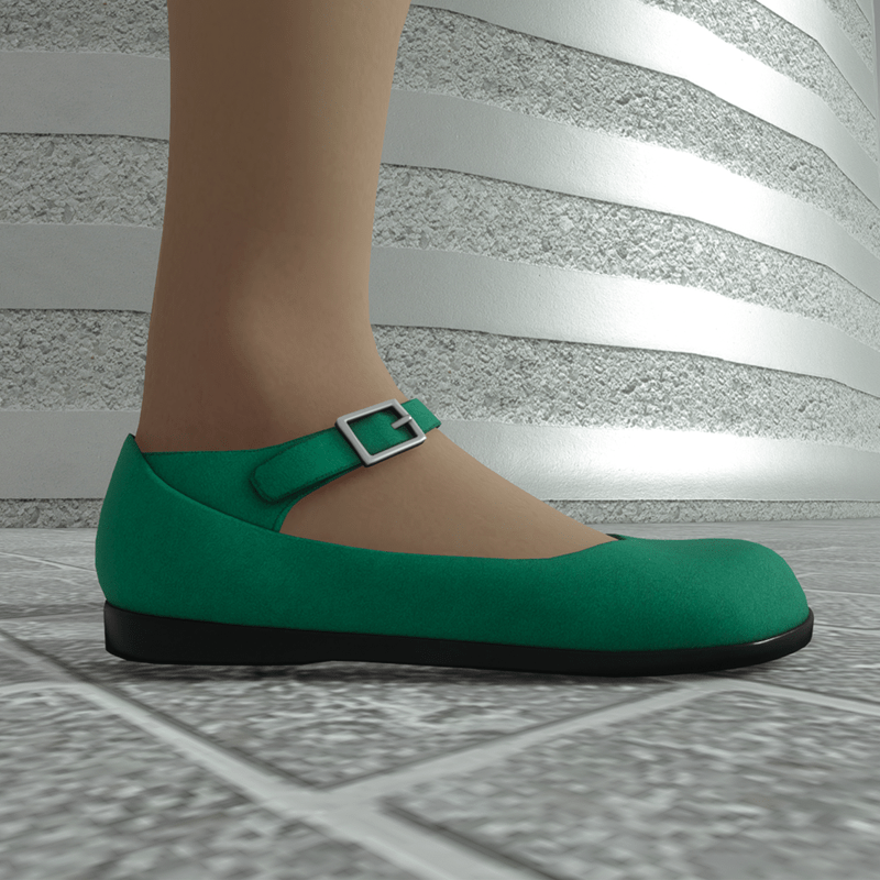 A pair of mary jane style cute flat shoes, with matte green leather upper and black rubber outsole. It fastens with a buckle strap. Please get the free demo item to check the style and fitness before purchasing here: https://store.sansar.com/listings/478f1485-b477-4cdd-b242-f2a11c482700/av-20---mary-jane-flats---demo