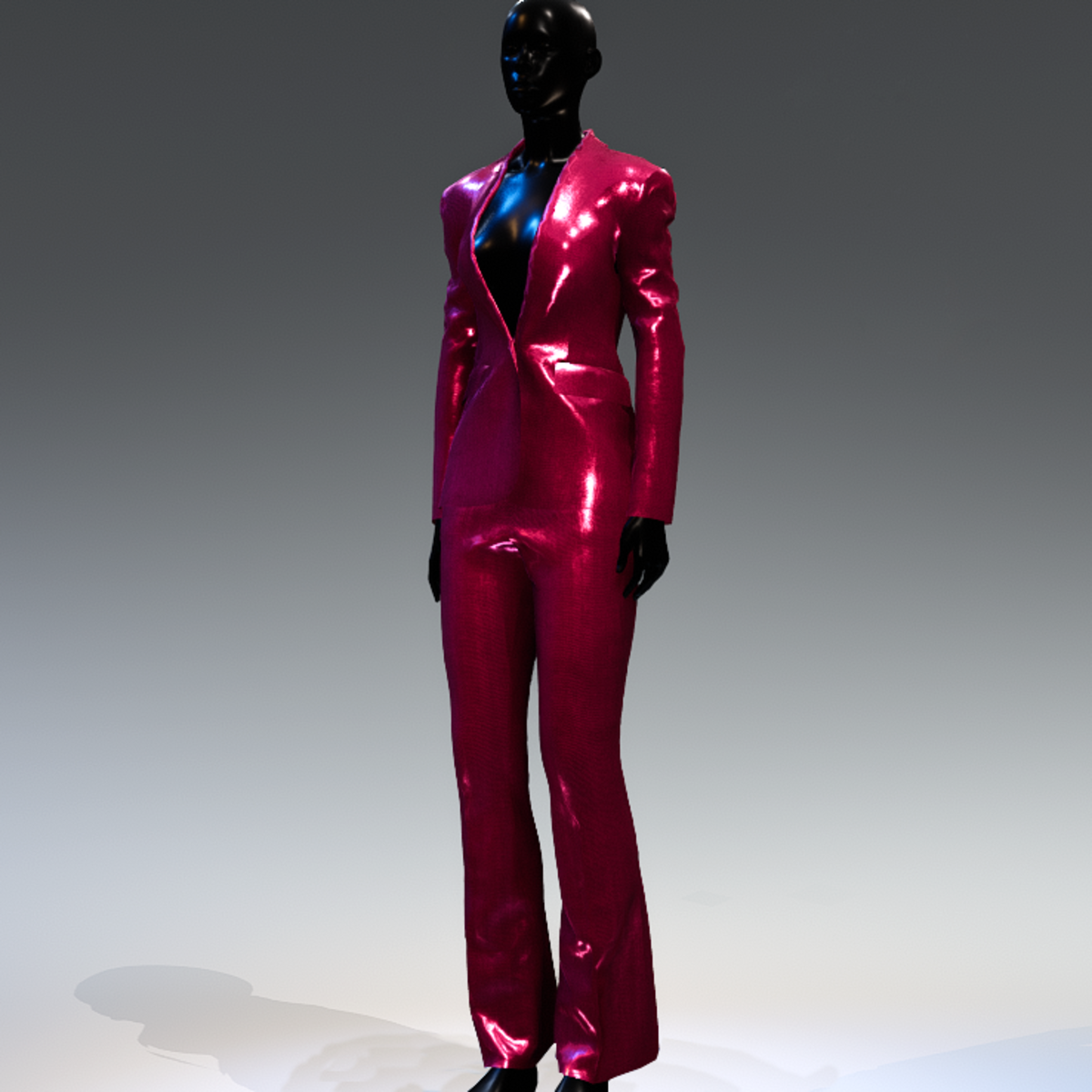 A suit in 70's style with buttons and bell bottom in shiny fuchsia colour.