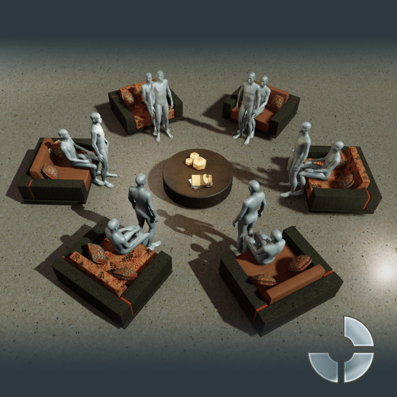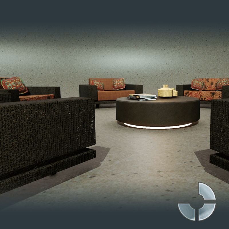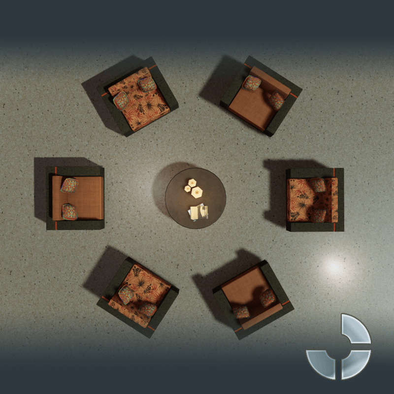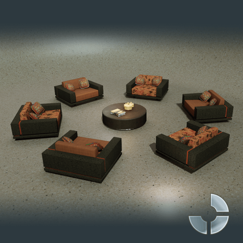 Set of 6 modern outdoors armchairs with a decorated coffee table. Content of the Bundle: - 6 Rustic straw armchairs . 1.5 K Polygons each one- PBR Textures - 1 Coffeetable. 306 Poligons each one - 12 Cushions. 416 Poligons each one - 4 Books. 84 Poligons each one - 3 Jars. 60 poligons each one.