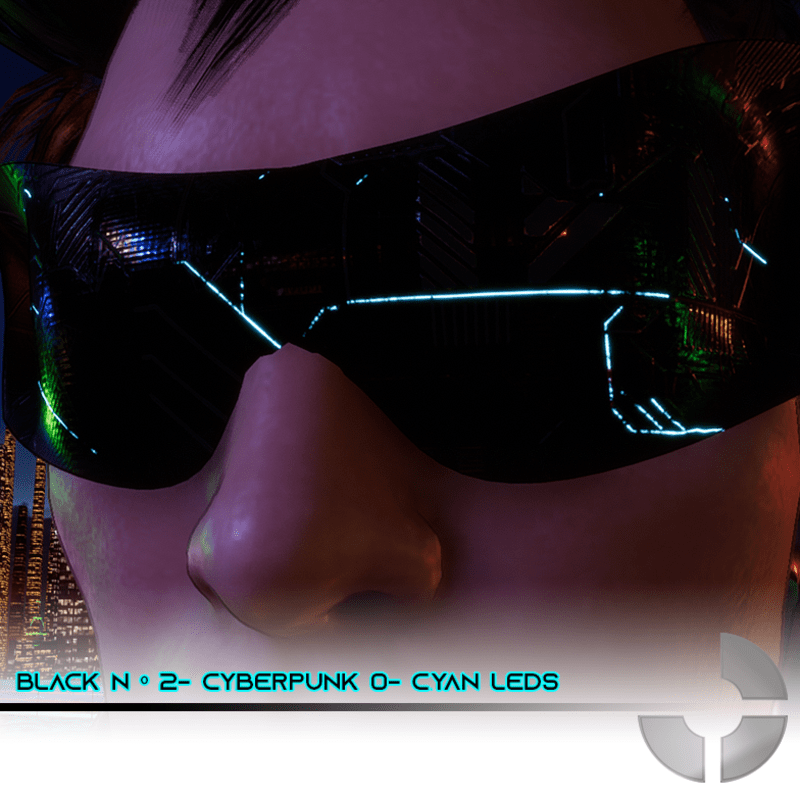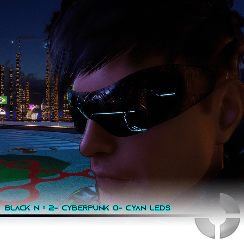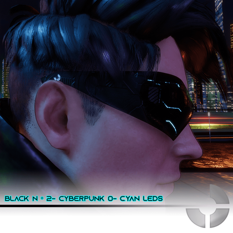 A Cyberpunk Second Version of a Classic Black Nº1. With Cyan Leds Male Version- Female can wear with adjustments A Sun Glass with PBR texture. Match with almost humanoids avatars in Sansar. Just a few adjustments to fit.