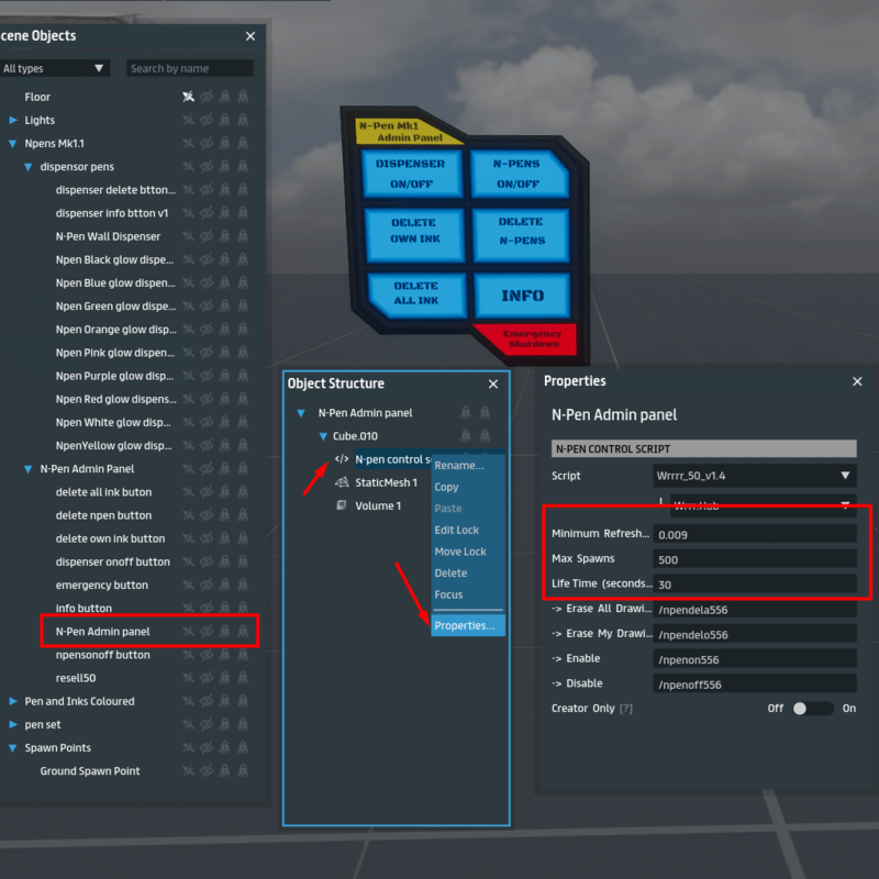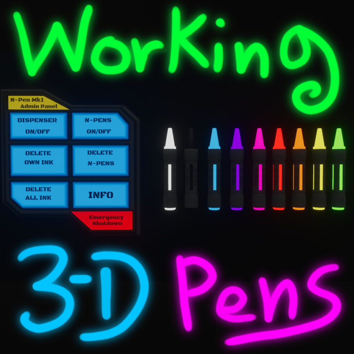 Comes in two separate versions, the first version is a dispenser you can setup on a wall, which allows multiple users to use multiple pens at the same time. The amount of pens spawned can be set on the dispenser script if you require larger or smaller limits. (default to 4 of each colour) The second version is a single set of coloured pens that users will need to share as no more can be spawned live in world. Dispenser Set Listing: https://store.sansar.com/listings/f4a029d5-c1c0-44ef-84e6-621439cf6b21/n-pens-mk11-dispenser-and-a-panel This is the Single Set Version of the N-Pens Mk1 Users will need to share the colours or you will need to provide more pens in the build. -DO NOT ADD MORE THAN ONE ADMIN PANEL- Actual working 3D pens, yes you can actually draw with these in world! even on desktop (with limitation but very doable) WARNING! the pens have the ability to temporarily create many draws that increases per person in use of pens, some safeguards are included to aid in keeping the count down, these can be made to be more or less aggressive in the admin hub script settings. -Timed auto delete ink -Settable ink level per person <- this is the main option to consider -spawn rate of ink (Default is a mid setting for use in optimized worlds) --DO NOT DUPLICATE THE ADMIN PANEL-- Only (one)1 admin panel per world, you can duplicate the dispenser or the provided pens if needed in more locations, the script in this panel has the limit controls for the pens to help with draw counts. The included admin panel is meant to be placed in a secure location for example a DJ booth or known secret area where everything can be turned off and pens disabled if needed (there is a owner only option on enable/disable/delete all ink but the world owner must be present if selected in the script to use) Pressing the emergency shutdown will stop the dispenser, delete all pens and clear all ink until pressed again to re-enable usage of pens. If something goes really wrong hitting this will stop everything Example Gifs: https://gyazo.com/dd738b852b2aeb304b19f9db0fc1428c https://gyazo.com/1cb9919d244e683afec07256b194df74 Try out a free demo of the pens in action at this world: https://atlas.sansar.com/experiences/thenick-1981/n-pens-a-world-of-light-and-colour