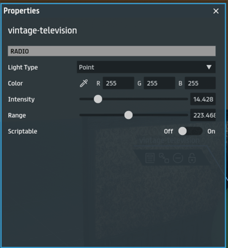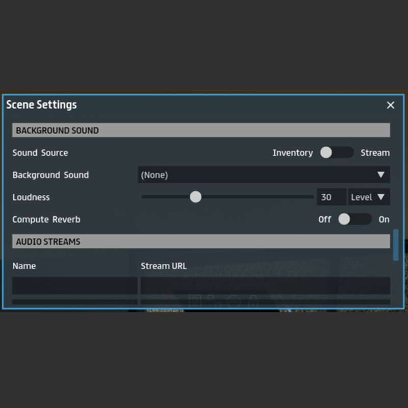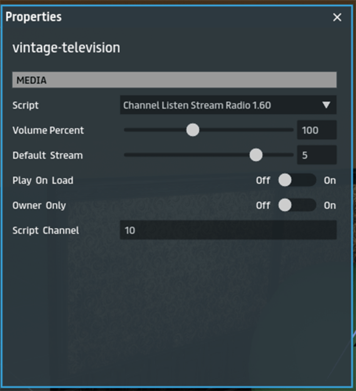 Scripted classic style television: Click to turn on/off: Can be further scripted to switch between channel streams. More information below to setup. View images... TEST STREAM [Add to scene settings] https://www.youtube.com/embed/cs2j8f7H2WY?autoplay=1&loop=1&controls=0&allowfullscreen=1&playlist=cs2j8f7H2WY DEMO VIDEO https://www.youtube.com/watch?time_continue=2&v=PYwf8RKN9lI ADDING YOUR OWN STREAM https://help.sansar.com/hc/en-us/articles/115003259666-Using-and-previewing-media-streams