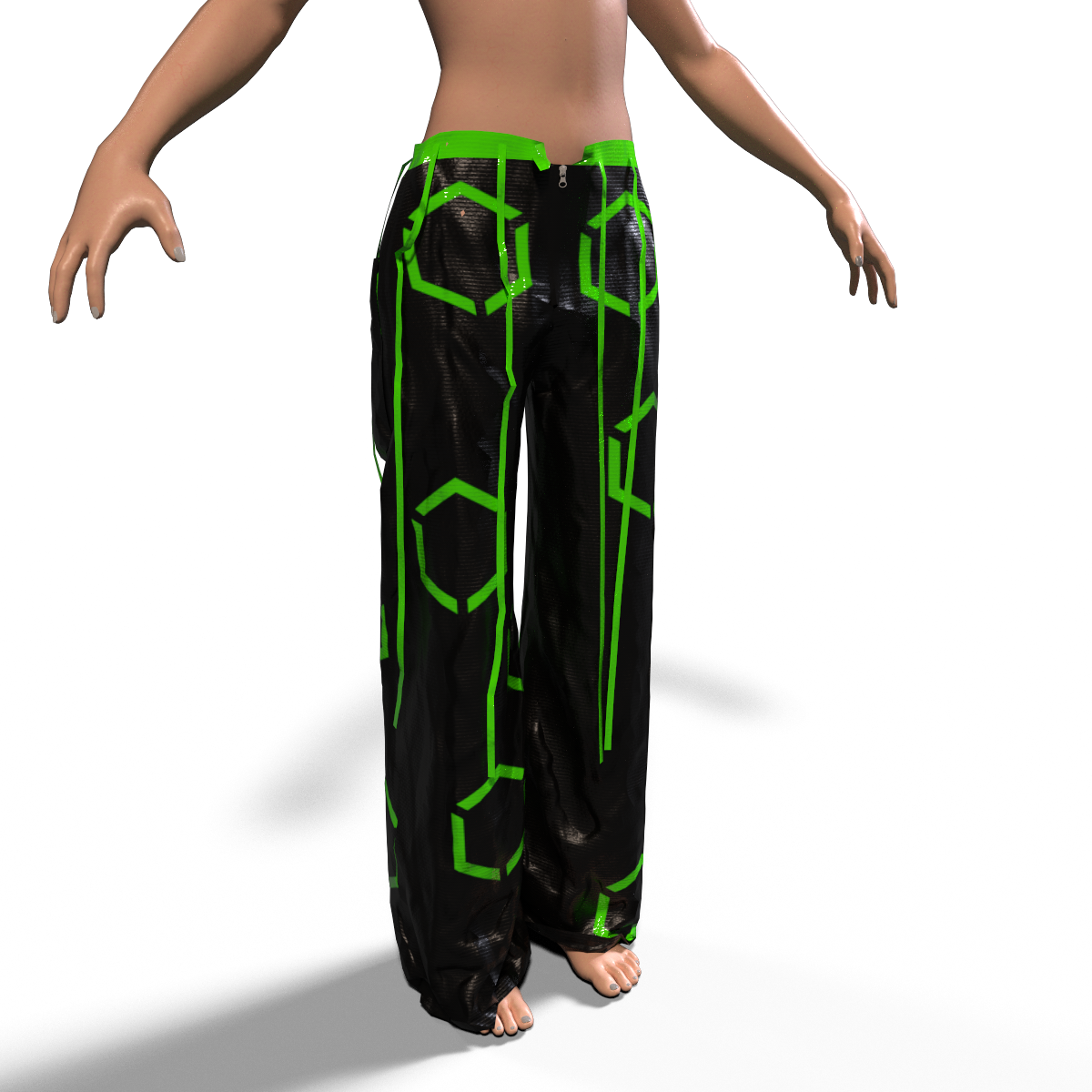 Hex design raver style (I guess) leather-ish material with Coloured highlights and dangly bits Sized for female and shorter avatars. I hope they are enjoyed and as always, Thanks for downloading.