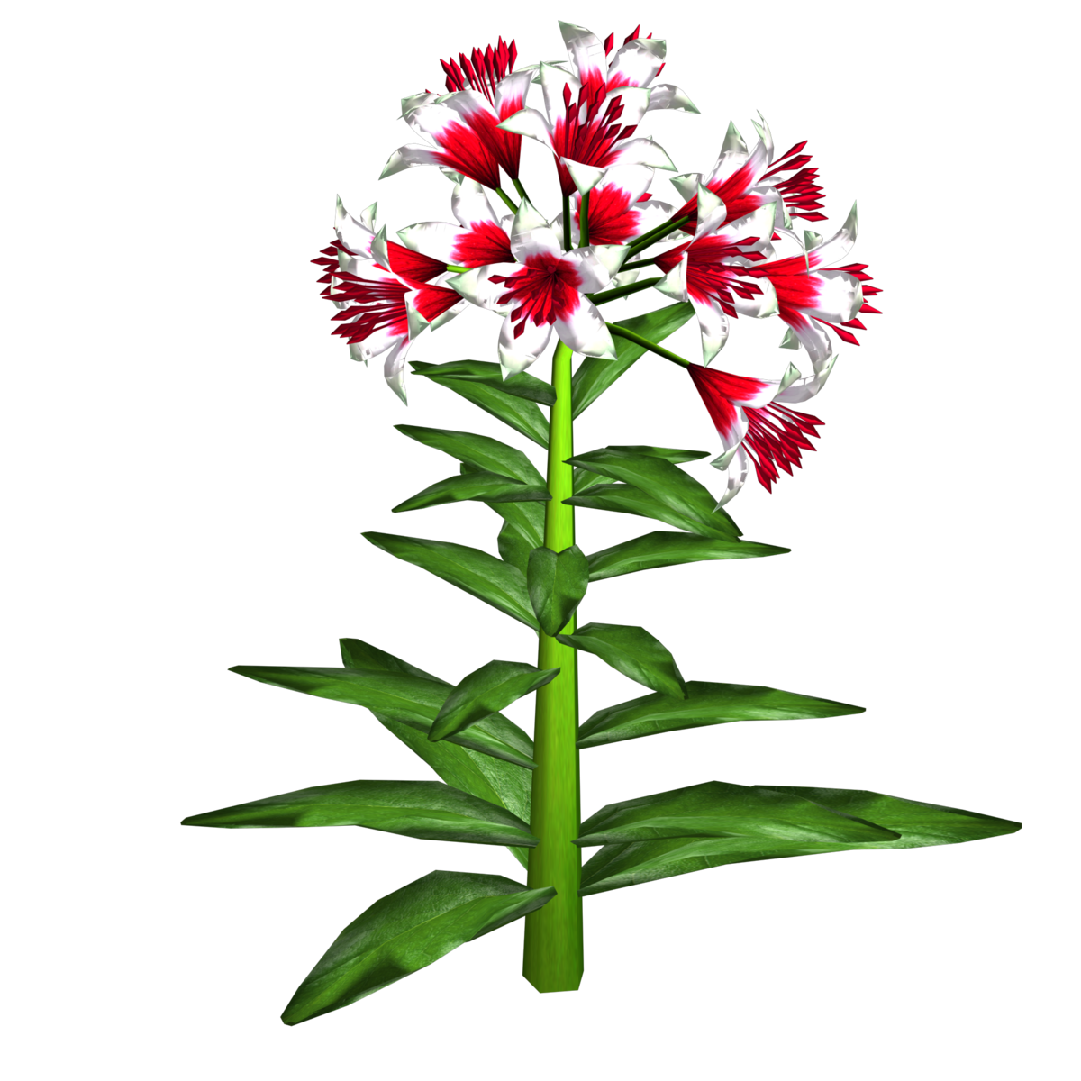 1 Trumpet Lily Plant with about 14 blooming lily flowers and several leaves for your lovely gardens. Polygon count: 15480. There is no collision on this mesh so you can walk through it. I have many colors. To see this flower in Atlas, please visit "LovedWarrior's Ground Plants: https://atlas.sansar.com/experiences/lovedwarrior/lovedwarrior-s-ground-plants" Please note that all my flowers are 100% detailed mesh. Each petal, pollen, stalk and leaf is made by hand and placed by hand. All the textures are also made by me. If you have any flower or plant requests, show me a picture of the flower and I will let you know if I can make it for you. Enjoy!