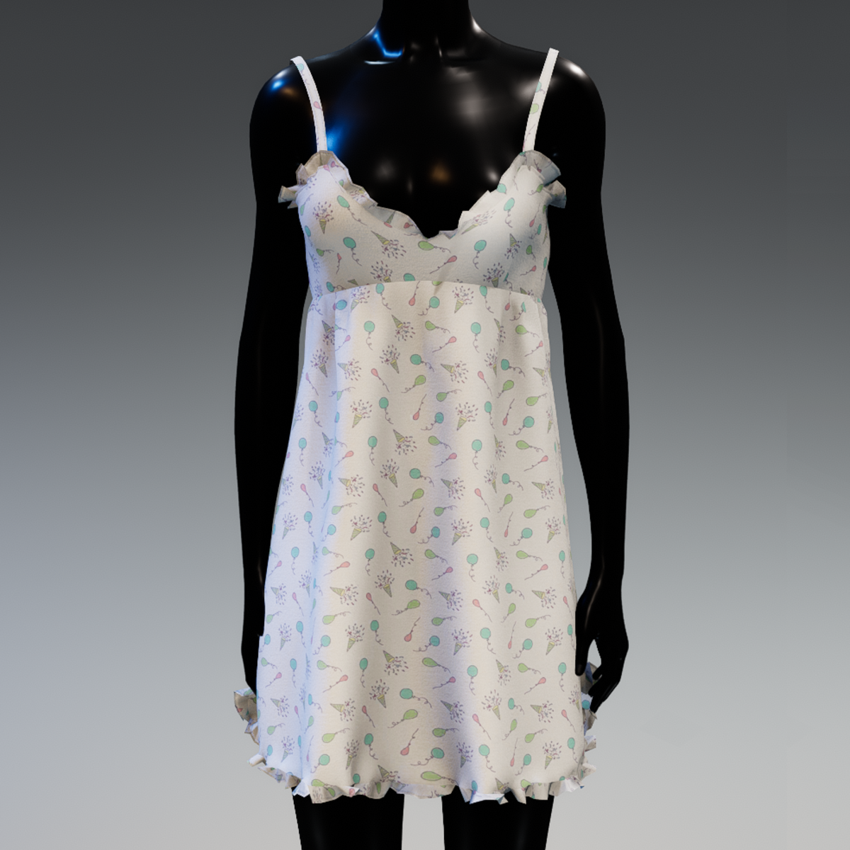 A cute, short nightwear with straps, ruffles and party themed printed pattern.