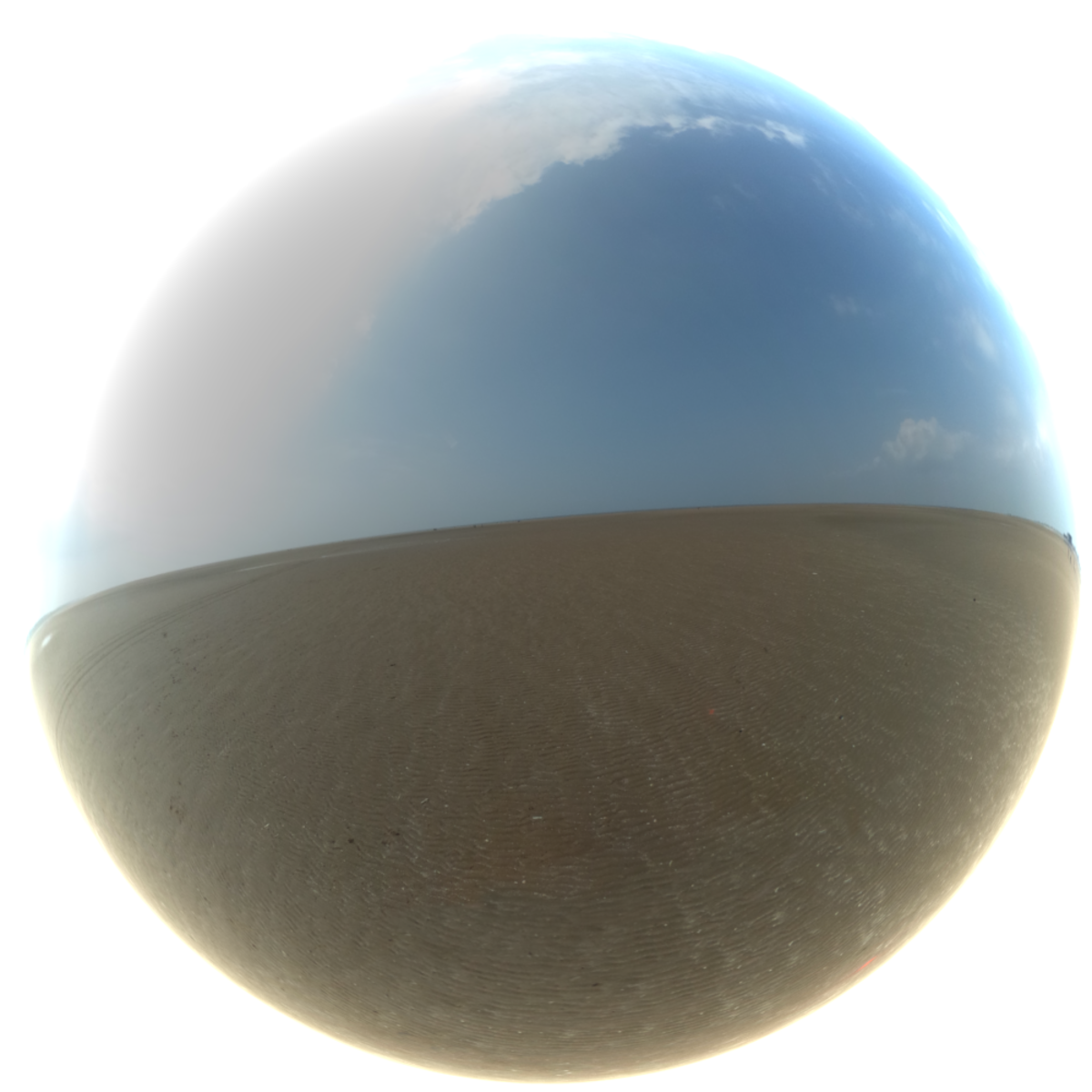 Bright and sunny day at the beach with minimal clouds, wet sand.