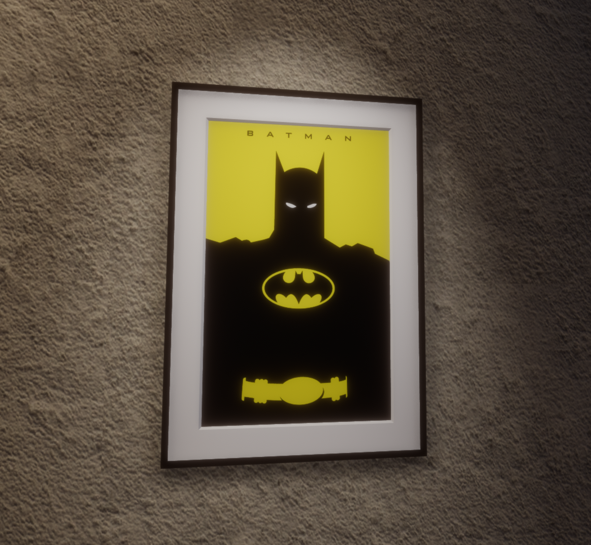 This original illustration features Batman in a minimalistic style. The art is surrounded by a white matte and sleek black metal frame. It is perfect for any superhero fan or Gotham household.