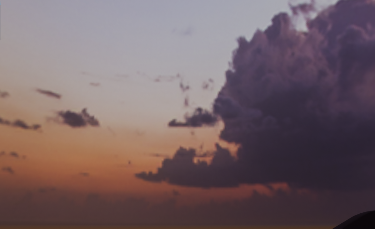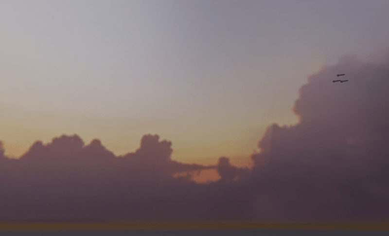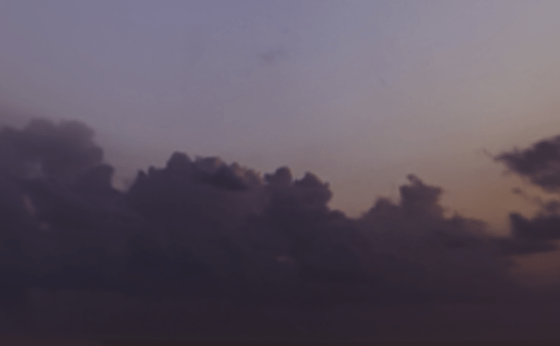A curtain of thick purple clouds hangs in an orange and yellow sky over the Caribbean Sea.