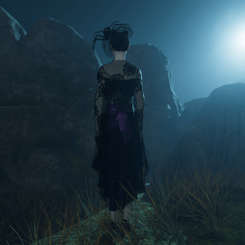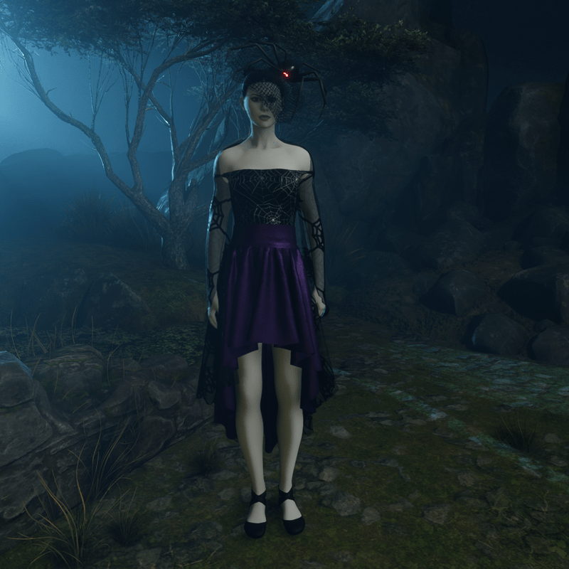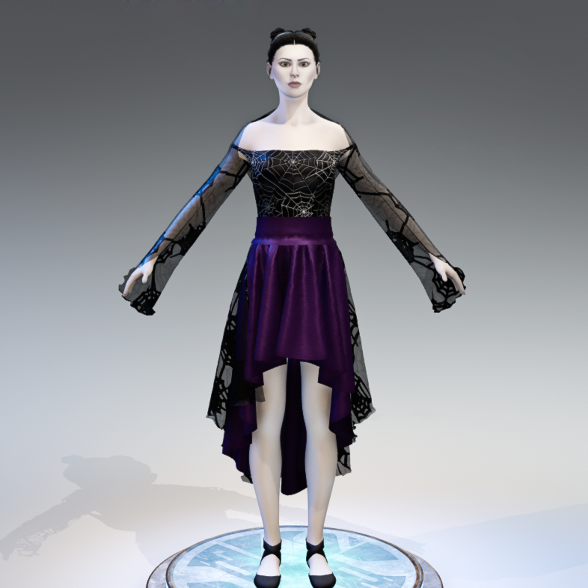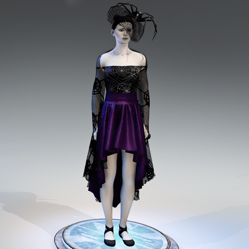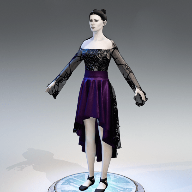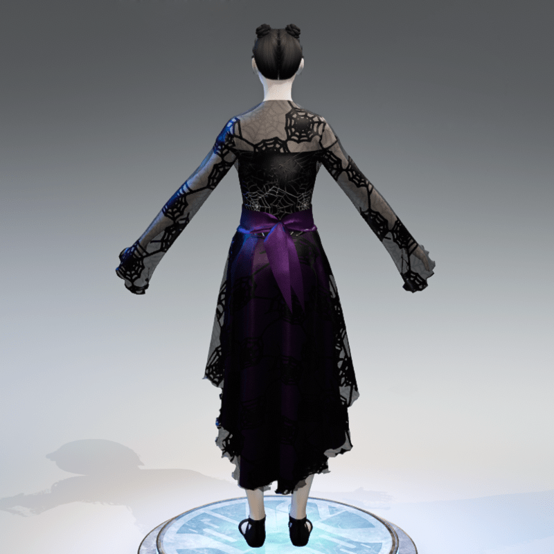 An asymmetrical formal dress and matching bolero in dark purple and black colour, with spider net pattern.