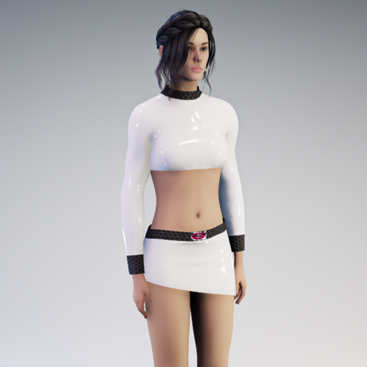 High quality latex outfit with long sleeve top, miniskirt and belt with metal belt buckle. Please don´t forget the ratings ;) Please simulate the clothes before wearing it to adjust it optimally.