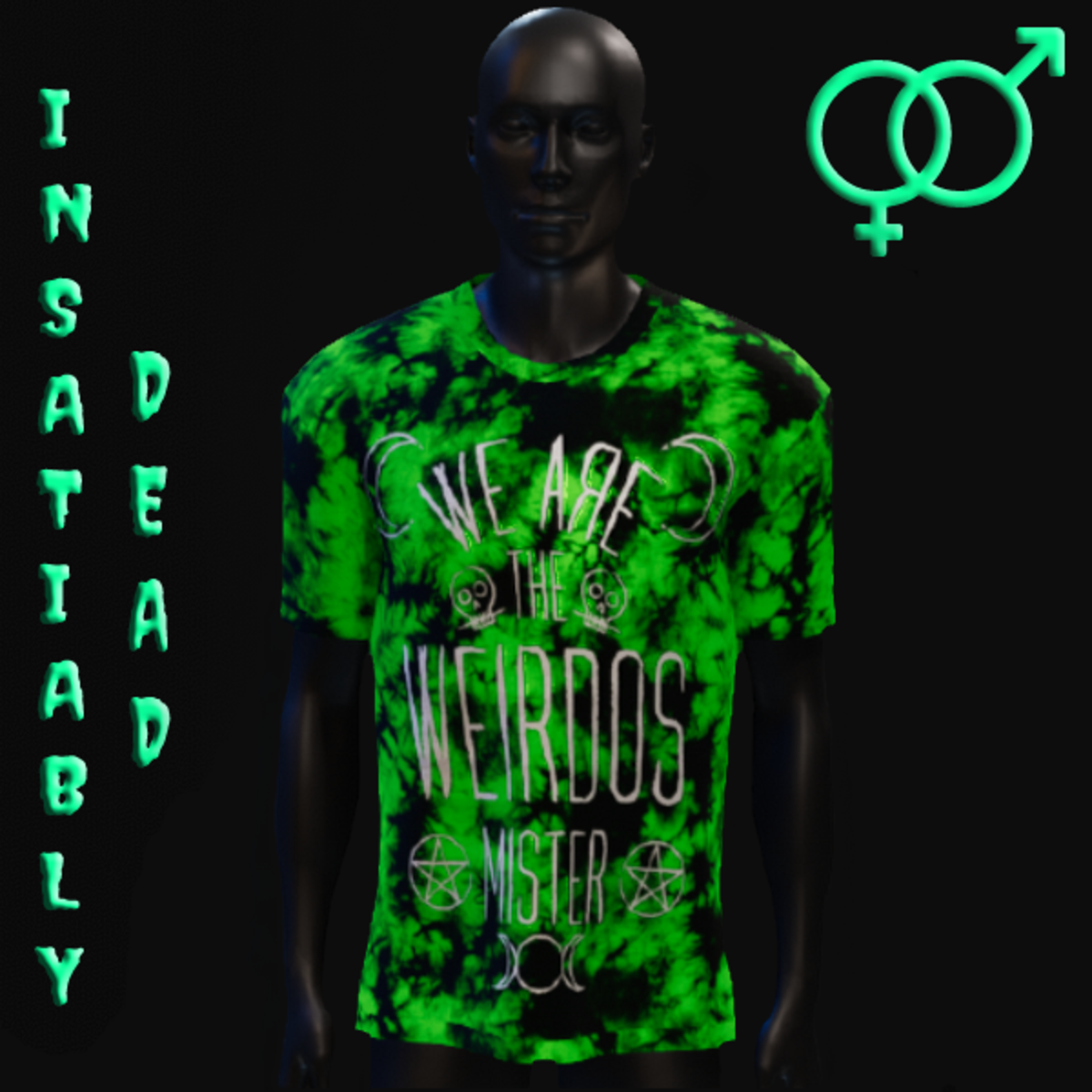 FOR ALL THE GHOULS AND GALS. UNISEX "WE ARE THE WEIRDOS MISTER" T-SHIRT DARK TIE DYE [BLACK/GREEN]. CREATED IN MARVELOUS DESIGNER WITH AVATAR 2.0. ADJUSTMENT MAY BE REQUIRED! FITTING INSTRUCTIONS CAN BE FOUND BY GOING TO THE LINK BELOW. https://help.sansar.com/hc/en-us/articles/115005693363-Fitting-Marvelous-Designer-clothing-to-your-avatar PLEASE RATE AFTER BUYING! IF ANY ISSUES OCCUR PLEASE CONTACT TEAGAN BROKKEN FOR ASSISTANCE. THANK YOU! <3 <3 GET INSATIABLY DEAD <3