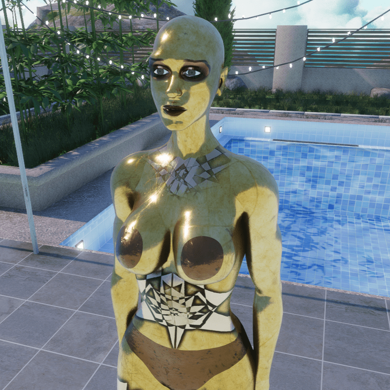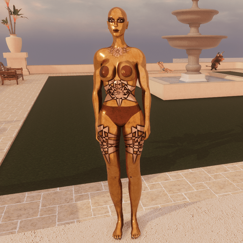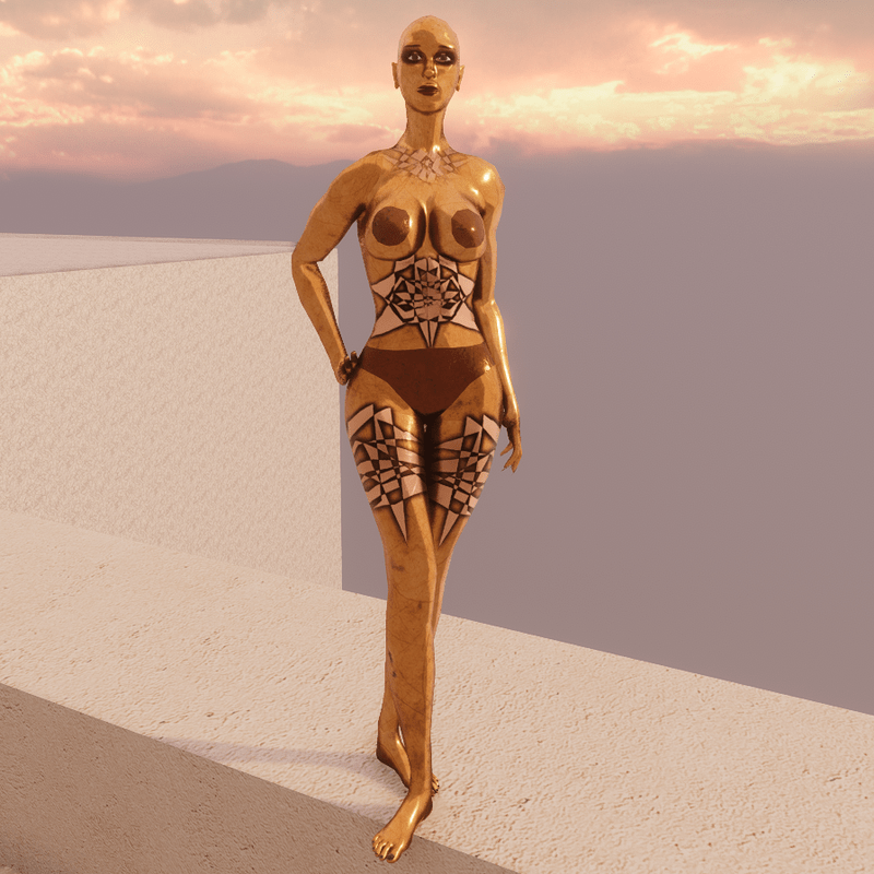 Golden Art Woman has emote in here face and is perfectly rigged so hands/mouth/eyes, etc works good Its is a Customizable Pretty Avatar who can wear Clothes, Hair and accessoires. Emote can also be applied so you can Dance. She got beautiful eyes, Sexy eyeshadow, glossy lipstick. Just see my items in my experience: https://atlas.sansar.com/experiences/acpixl/acpixl-animation-avatar-store