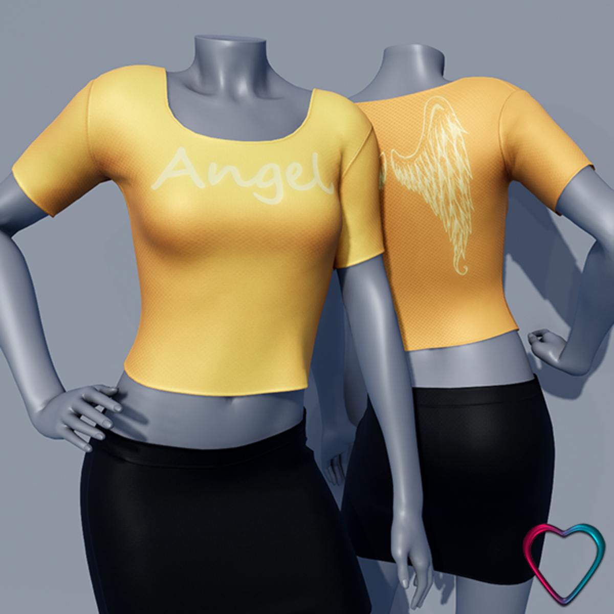 Bring a touch of divine elegance to your collection with our "Angel" T-shirt. Proudly displaying the word "Angel" on the front and featuring beautiful angel wings printed on the back, this fitted crop top is designed to capture the essence of celestial grace. Available in 16 vibrant colors, each T-shirt offers the perfect blend of comfort and style, making it ideal for various occasions. Pair it with the matching skirt for a complete and harmonious look, or mix and match colors to create your own unique style. ------------------------------ Technical Details: - Material: Stretchy and breathable fabric for optimal comfort - Design: High-definition print of the word "Angel" and angel wings - Colors: 16 vibrant and durable color options ------------------------------ You can see them in Sansar here: https://atlas.sansar.com/experiences/morganeparis/mpp-mainstore PS: I created it from scratch. I hope you like it. Enjoy and Keep Good Vibes. Hugs from Morgane.