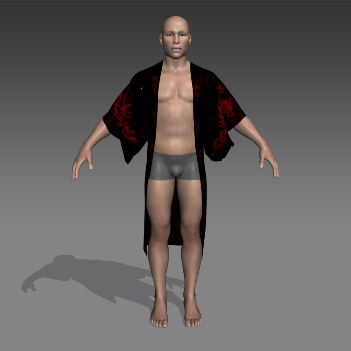 A kimono robe using the traditional pattern. It has dragons on the sleeve and back. It is edged with kanji representing the Dancing Dragon style of kenjutsu. Red on black.