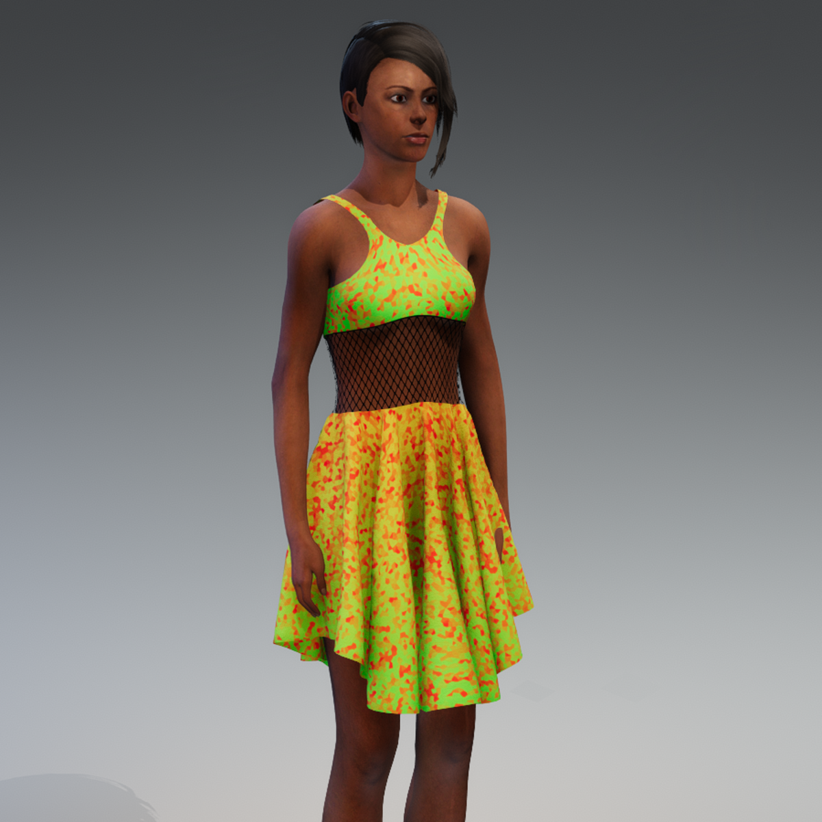 Modern dress made of high quality material and fishnet parts readdy for avatar 2.0. Please don´t forget the ratings ;) Feel free to simulate the clothes before wearing it to adjust it optimally. Visit my store inworld: https://atlas.sansar.com/experiences/randdy/rr-fashion-shop