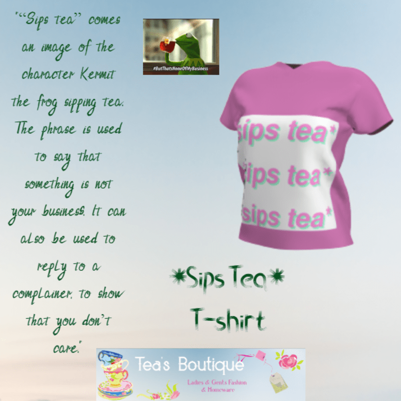 "“Sips tea” comes an image of the character Kermit the frog sipping tea. The phrase is used to say that something is not your business. It can also be used to reply to a complainer, to show that you don’t care." ~ Regular fit - Easy Wear ~ Avatar 2.0-compatible ~ More T's available in the Store. You can dynamically simulate this garment over your avatar to fit your favorite style. Feedback is Always Welcome. Regards Teacake Flickr: https://flic.kr/g/3egczE Main Store : https://profiles.sansar.com/profiles/TeaCake83-3881 psssst... Im looking for Bloggers, for more information check out Flickr or message me. :)