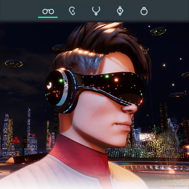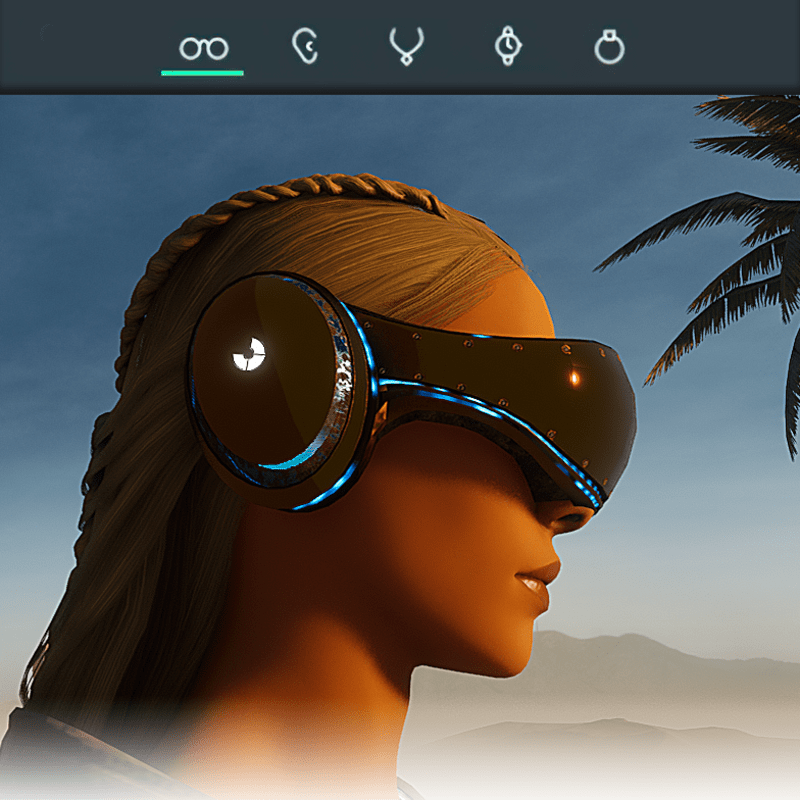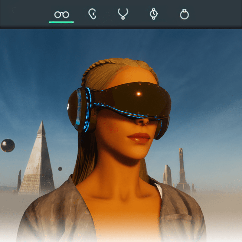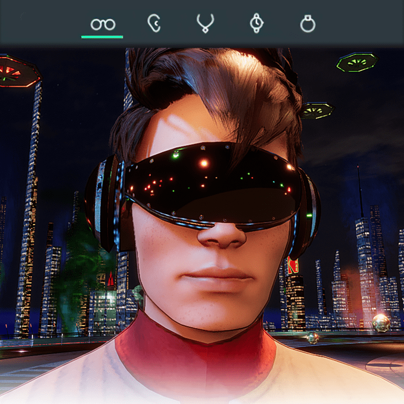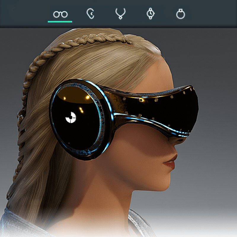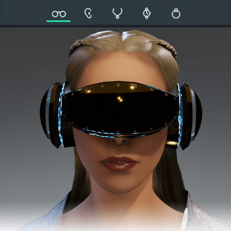 Visionary Design for a VR Headset exclusive for the Sansar Metaverse. These Vr Glasses do not mess up your avatar's hair. Minimal and Elegant Design. Vr glasses with headphones. Chrome Texture. Animated lights Inside. Unisex. Matches with all humanoid avatars. No need for adjustments for the default 2.0 Avatar of Sansar.