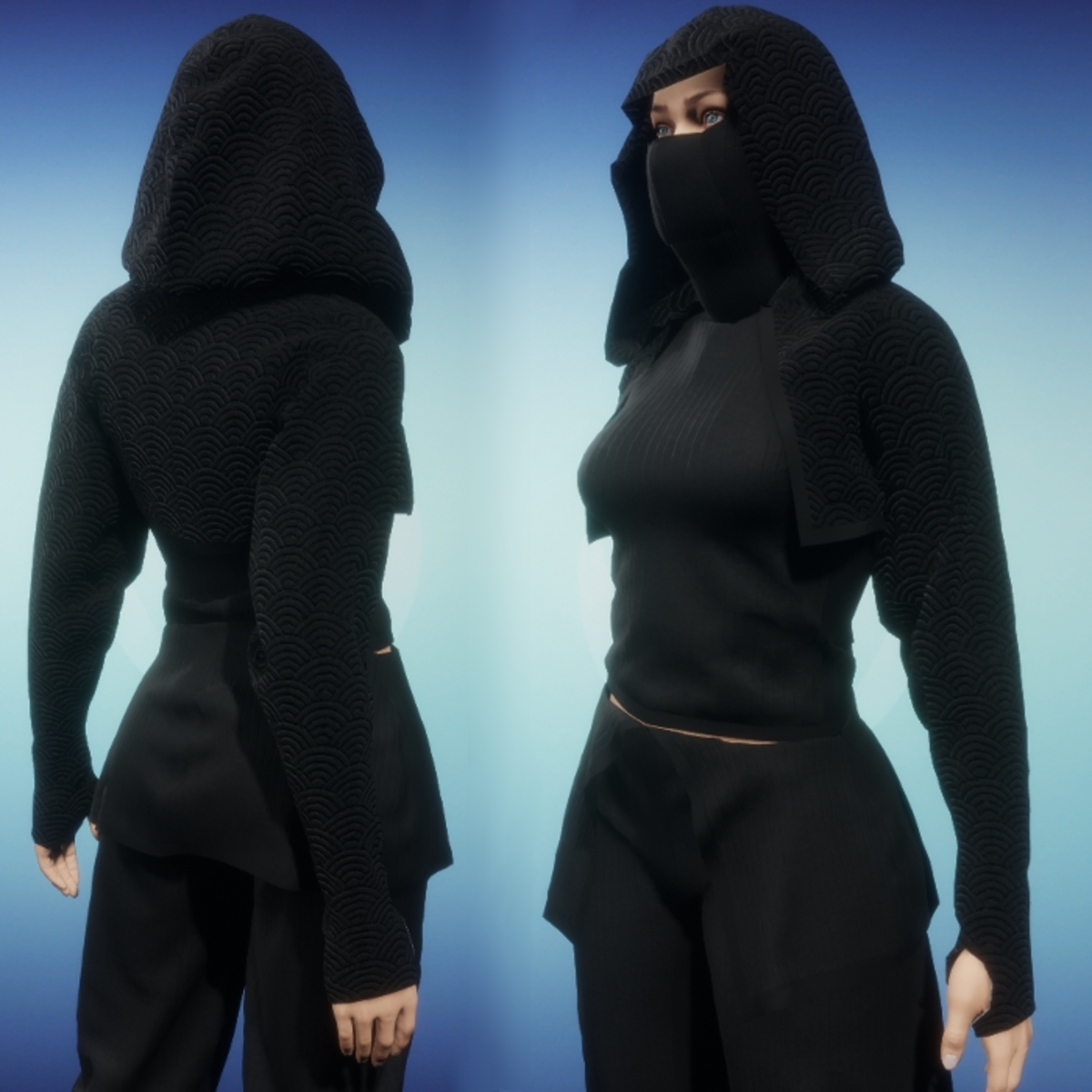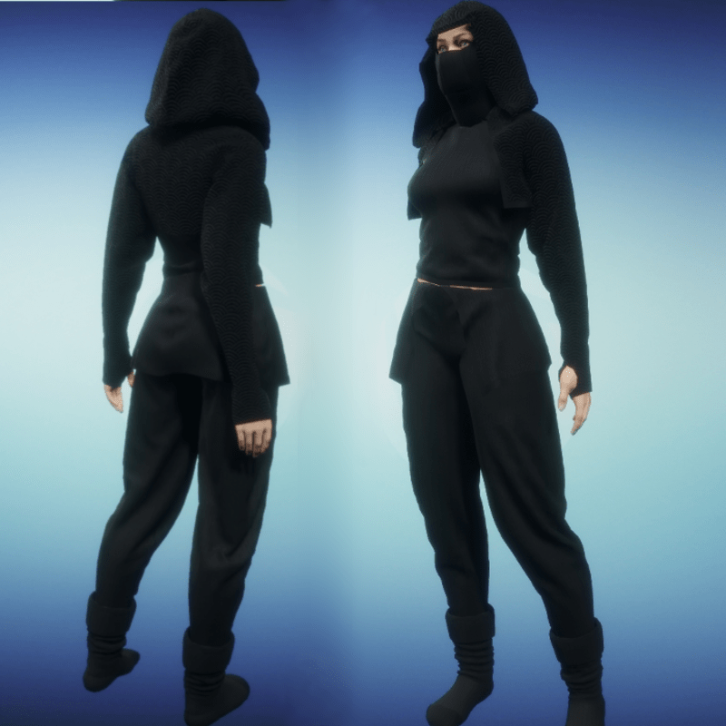 Full outfit for female avatar includes hooded cropped jacket, masked sleeveless top, ninja pants, and soft sole boots. Jacket is softly embossed with scalloped pattern. Top and pants have small flat panel insets as trim with the main fabric having a striped knitted texture. Boots are made of leather. Please be sure to hit the simulate button in the lookbook when wearing any clothing made in Marvelous Designer. This much improves the fit as well as gives you the chance to push the fabric around to your liking. Do not tug on the boots as this will make your toes poke through the leather. When you simulate the foot part of the boot will puff up and cover your foot completely. Ralph Vintorix has made a Katana designed to fit with this outfit. See it here: https://store.sansar.com/listings/6d37a57d-ef11-4787-81b8-3808ad8929fe/katana-for-sansar-female