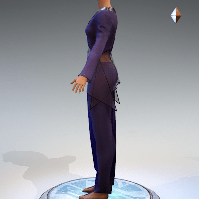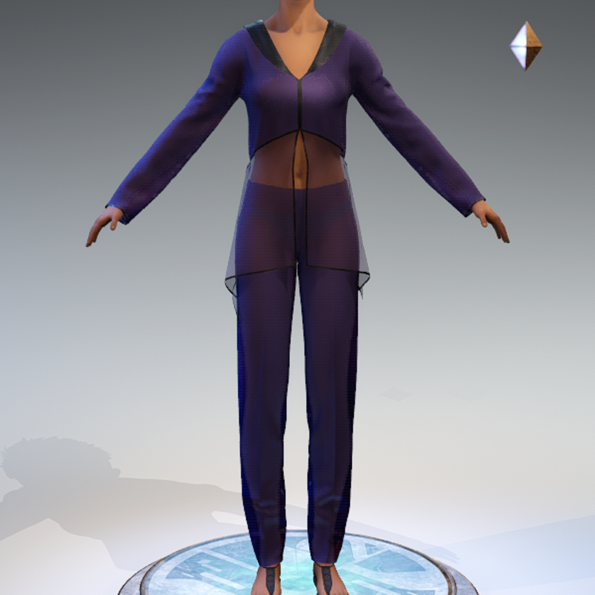 Elegant pant suit with a tunic-style blazer. The blazer features sheer panels and crocodile leather detailing and collar. By Sweet Distractions