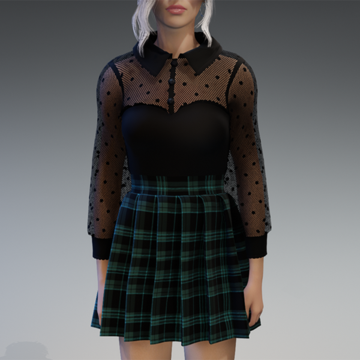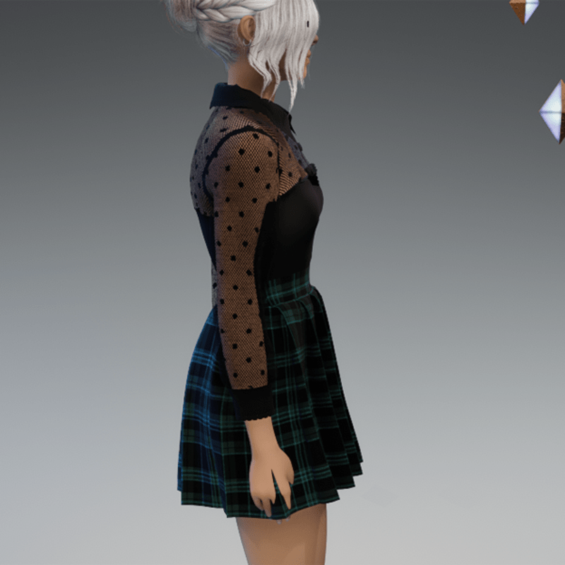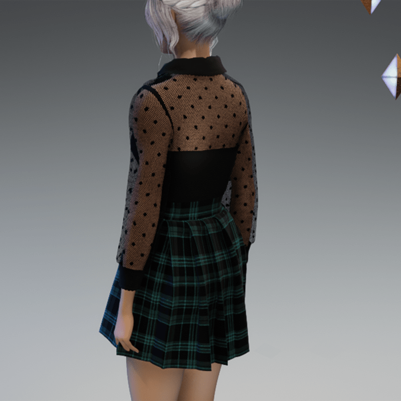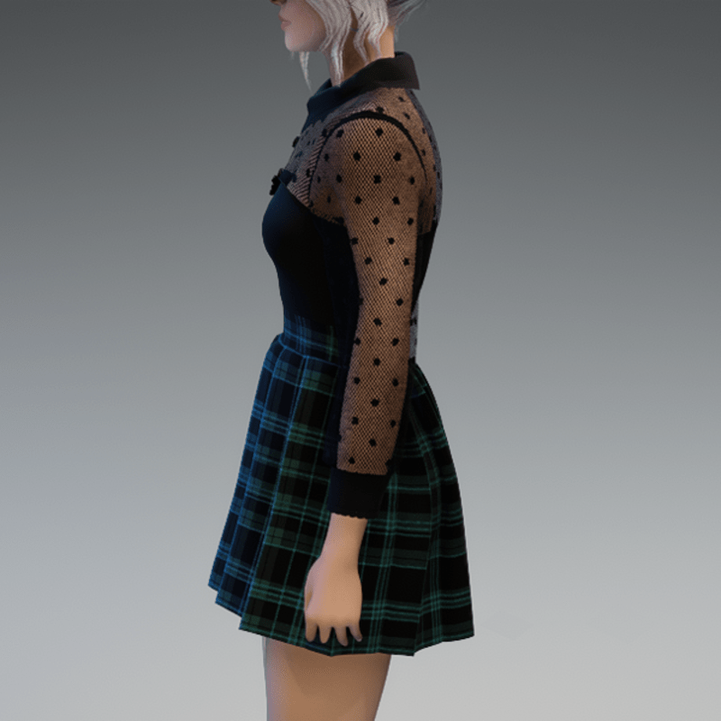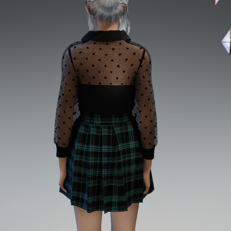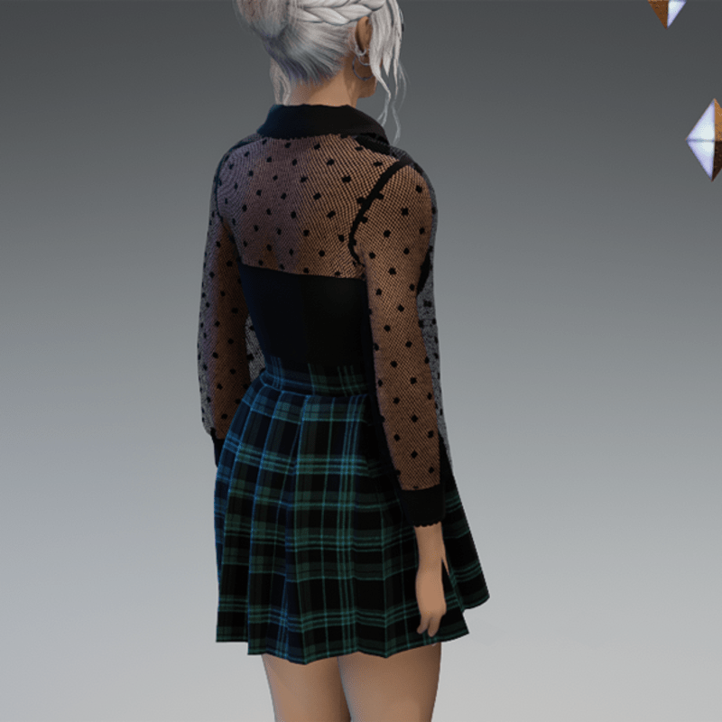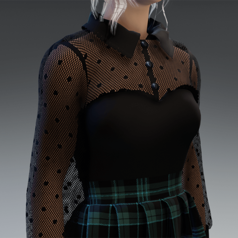 This cute and elegant outfit comes with a transparent dotted blouse top and a schoolgirl-styla skirt. Enjoy! <3