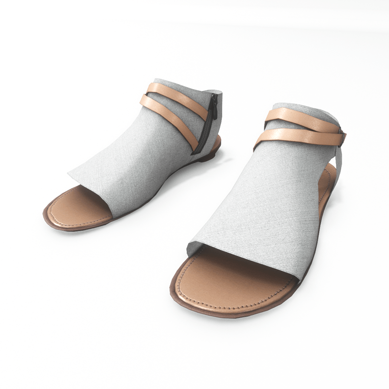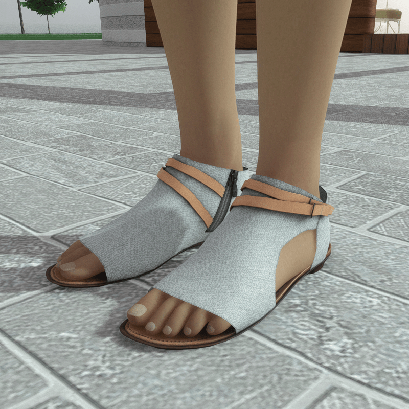 A modern pair of flat sandals made with white denim fabric. The shoes have an inside zipper closure and decorative leather straps around the ankle. Get the free demo to check style and fitness before purchasing here: https://store.sansar.com/listings/068ce114-0610-4487-8dcf-405b6ba01511/av-20---open-toe-textile-sandals---demo