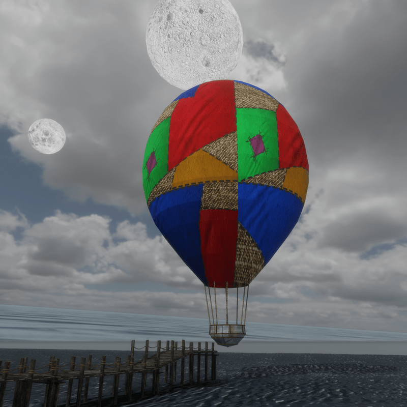 This is an animated hot air balloon. It takes a lazy circular bobbing path around any scene and then lands long enough for people to get on for a ride and a great view of your scene. Lots of fun.