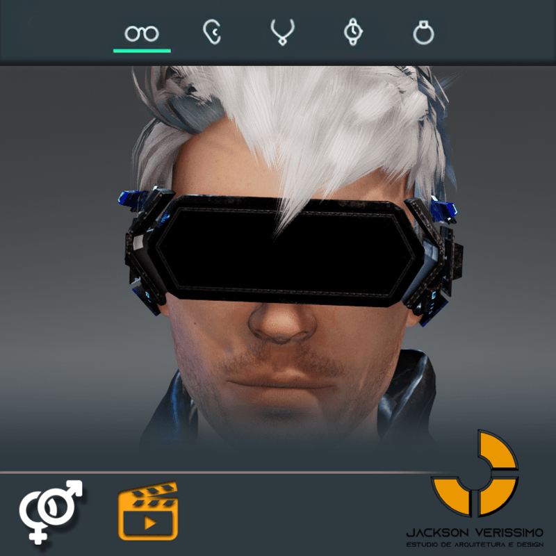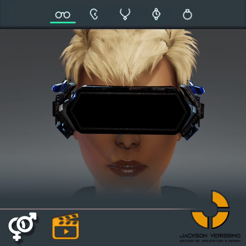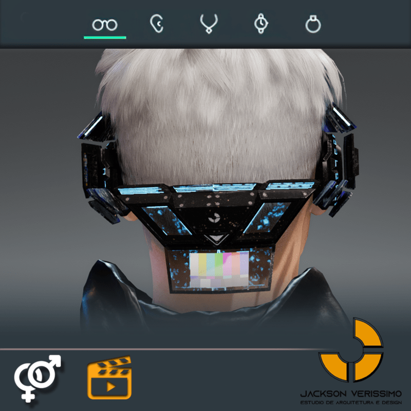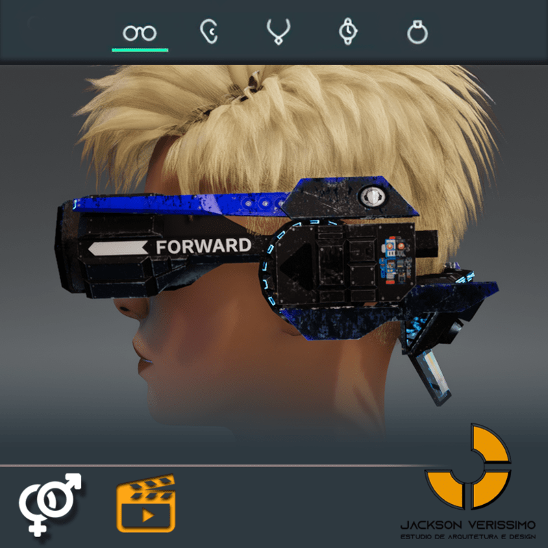 Visionary Design for a VR Headset exclusive for the Sansar Metaverse. Special and High Quality Texture. Vr glasses with headphones, Emissive lights and Media Screen. Unisex. Matches with all humanoid avatars. No need for adjustments for the default 2.0 Avatar of Sansar.