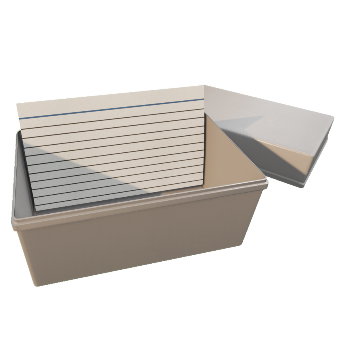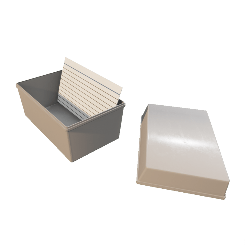 It’s a standard 3’‘x 5’‘ notecard with plastic box. The normal maps for the box are baked from the high poly model. triangles:740 (includes x1024 pbr textures but no collision.) If you have a question or feeling dizzy please do not hesitate to contact me at Sansar Discord or via Email (plaggy.net@gmail.com). I will be happy to help you.