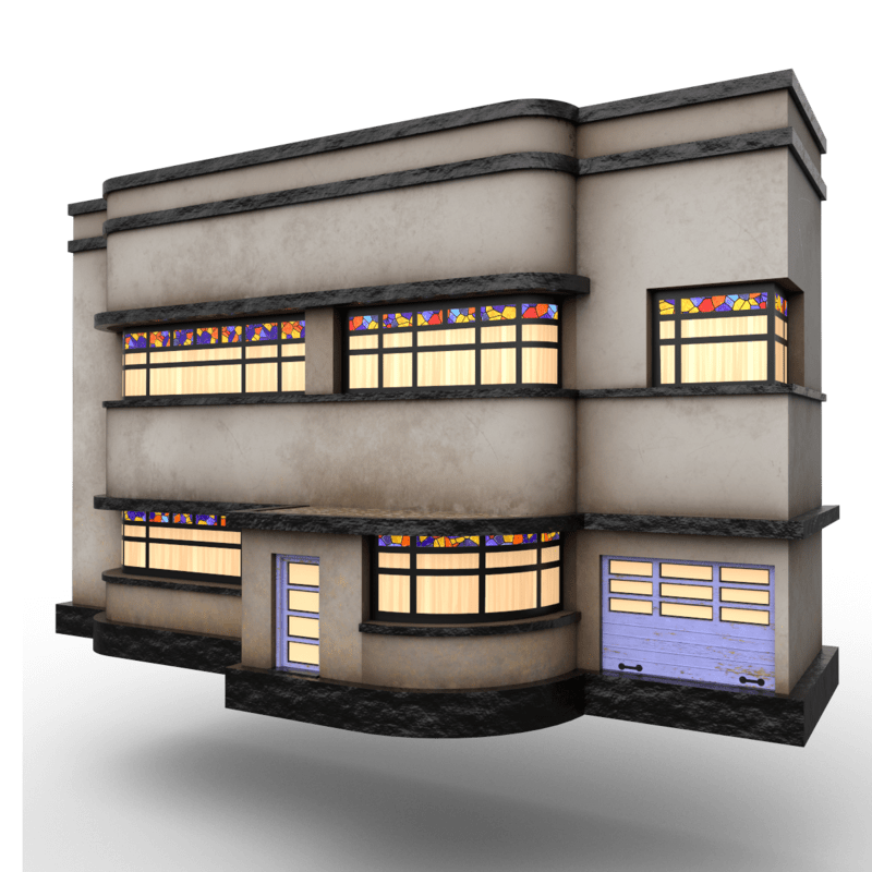 Art Deco prop to be used as background object to fill your scene. Note that is a prop and not a house you can enter! 2 objects (can be moved separately), mirrored houses as in a left and a right house. Emissive windows. Collision: Yes. (to make it more lively, you can add an audio volume to it with sound of ppl living there)