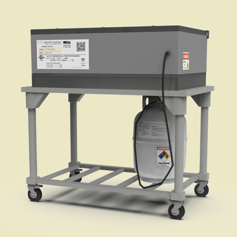 A stove-top burner, on a serving, table for kitchen and restaurant decor. The stove-top burner comes with a propane tank hook-up.