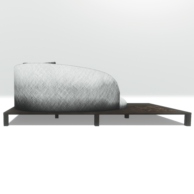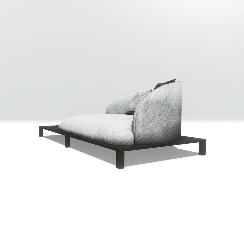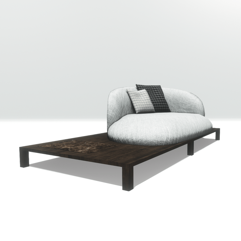 Two-seater sofa with white fabric and 2 cushions, in modern, asymmetrical design and low table base made of wood and marble. It is editable and has collisions.