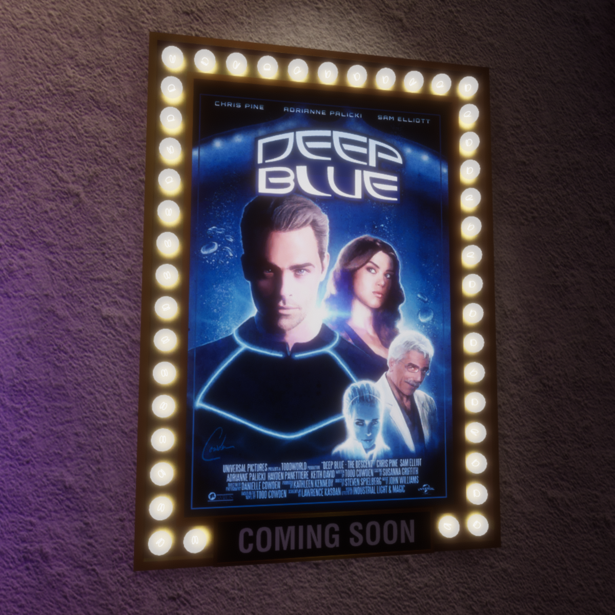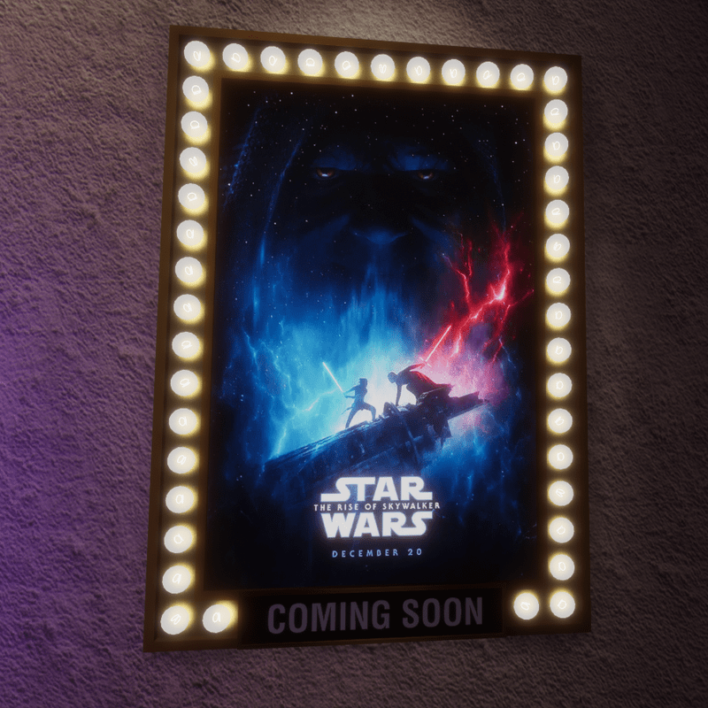 This light-up movie marquee sign features a polished metal frame surrounded by lights. You can feature your own backlit movie posters within the frame (simply be sure the height and width dimensions are divisible by 4. BE SURE TO UPLOAD YOUR MOVIE POSTER TO THE EMMISSIVE AND ALBEDO SLOTS). * "Back to the Future" and "Star Wars" posters not included, they are shown for demonstration purposes. * 3 editable materials (Frame, Movie Poster, Glass) * Includes Collider