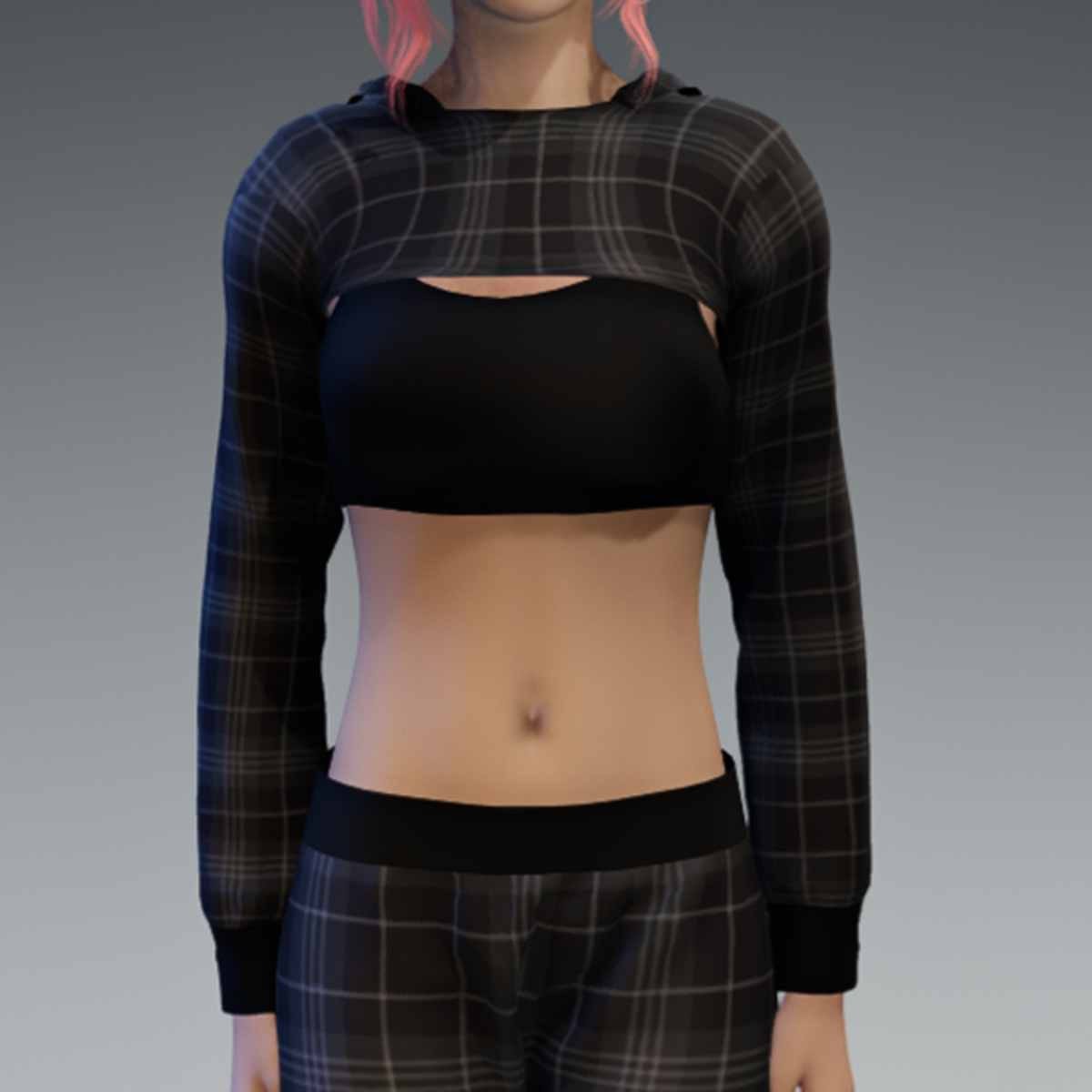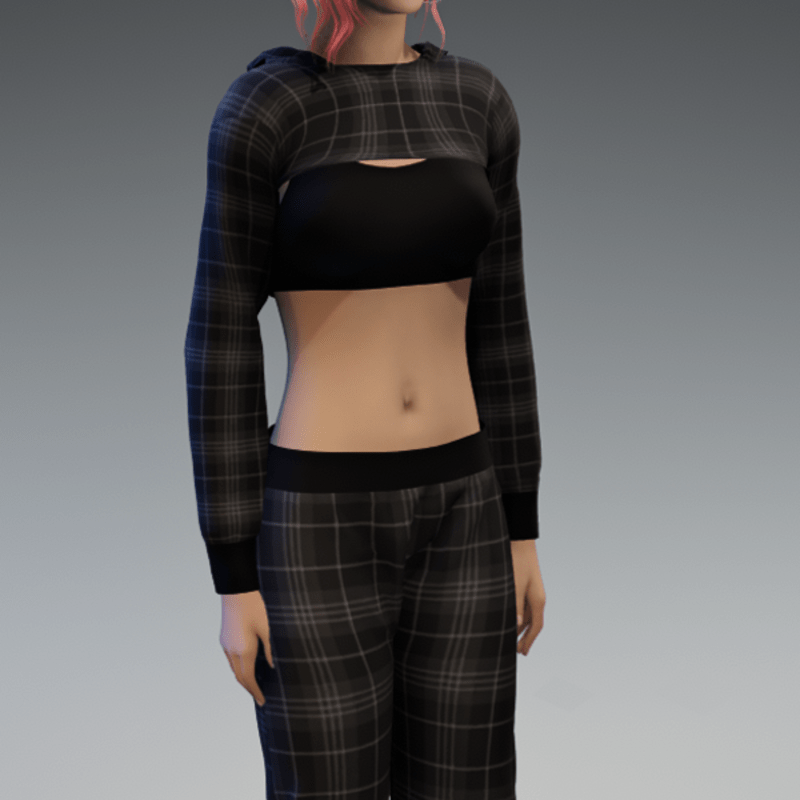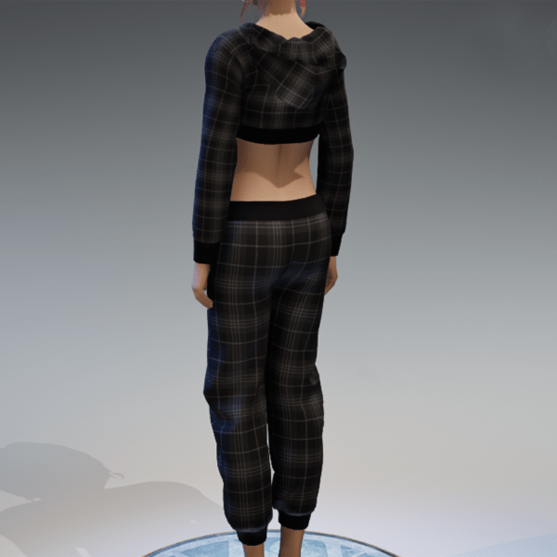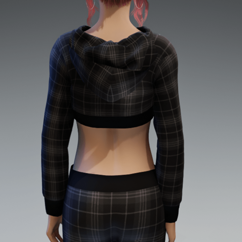 Includes the checkered hoodie and the black top as a full top. Please note, that the hood is just for optical "decoration" and may not fit the head of your avatar if you pull it up. For the full outfit showing in the image, check out my "Checkered Black & Gray Sweatpants". Enjoy!