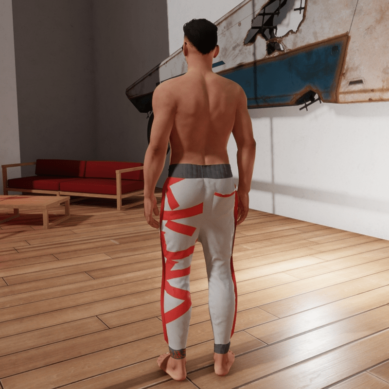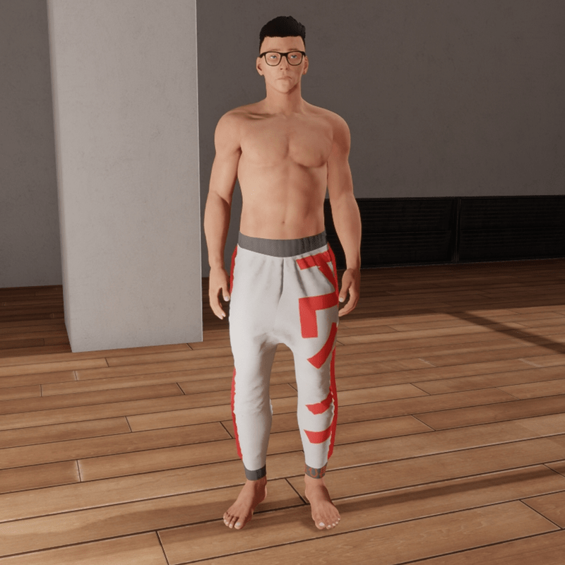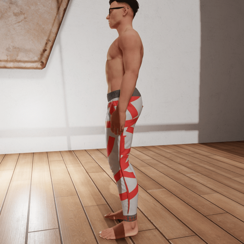 Men's drop crotch joggers with Japanese Kanji printed on the left leg and ankle. Red'fin'-like trim on both outer seems on legs. This item was made with MD so if you have any clipping issues give it a tug.