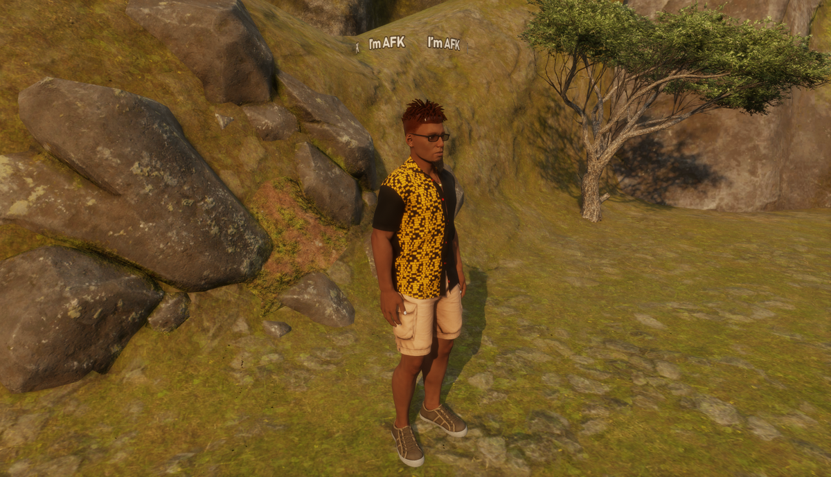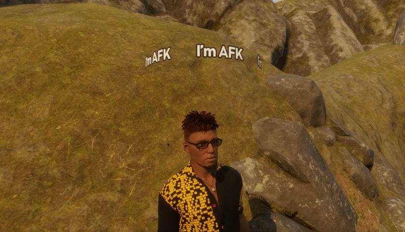 A simple model of a cylinder with an alpha texture reading "I'm AFK" around its rim. Its center point is on the ground where an avatar's own position is represented. This is designed to be used with the "/reflex afk" command, but can be used with any script designed to rez an object for that purpose.