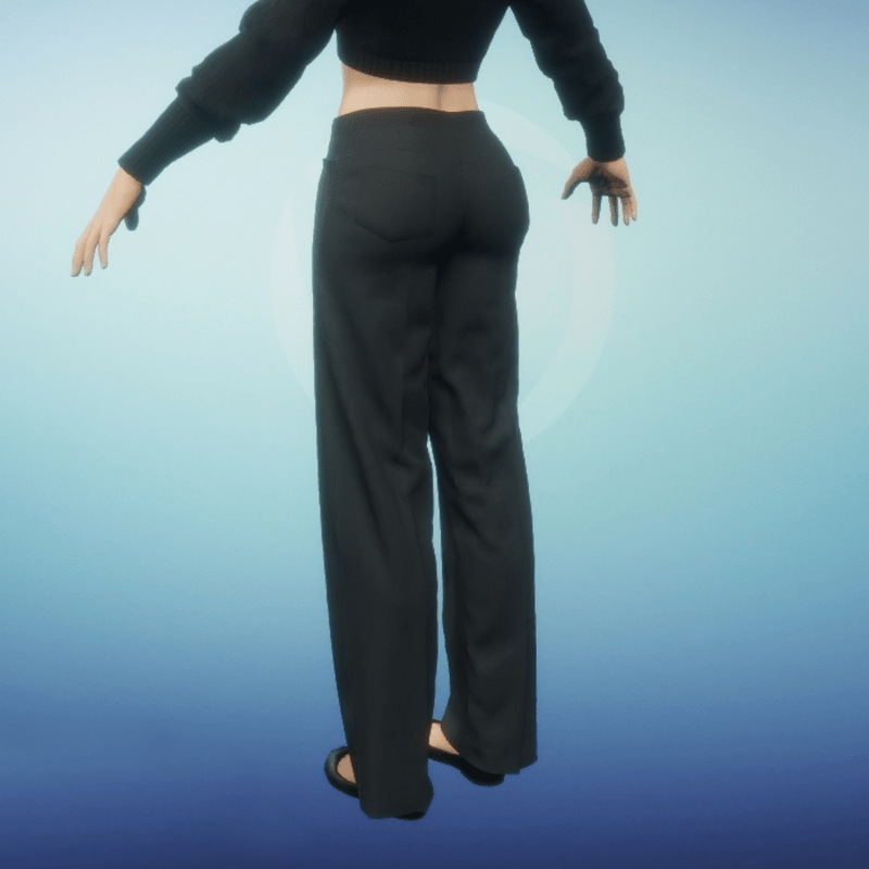 Women's dress slacks with front closure, welt pockets and back patch pockets. Front and back center legs have gently pressed folds for a dressy appearance. Be sure to animate cloth when wearing these slacks. Also, when layering, wear top layers first and then add lower layers. So if wanting to tuck in a shirt, where the shirt first then the slacks. If wanting to wear a top over the slacks wear the top first.