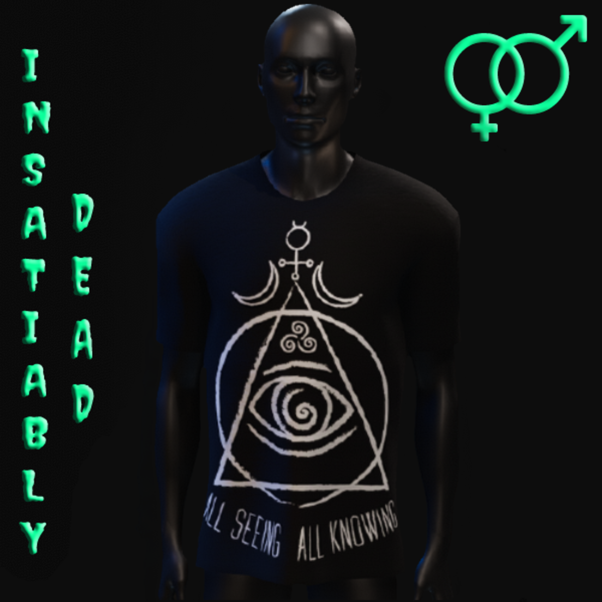 FOR ALL THE GHOULS AND GALS. UNISEX "ALL SEEING ALL KNOWING" T-SHIRT [BLACK/WHITE]. CREATED IN MARVELOUS DESIGNER WITH AVATAR 2.0. ADJUSTMENT MAY BE REQUIRED! FITTING INSTRUCTIONS CAN BE FOUND BY GOING TO THE LINK BELOW. https://help.sansar.com/hc/en-us/articles/115005693363-Fitting-Marvelous-Designer-clothing-to-your-avatar PLEASE RATE AFTER BUYING! IF ANY ISSUES OCCUR PLEASE CONTACT TEAGAN BROKKEN FOR ASSISTANCE. THANK YOU! <3 <3 GET INSATIABLY DEAD <3