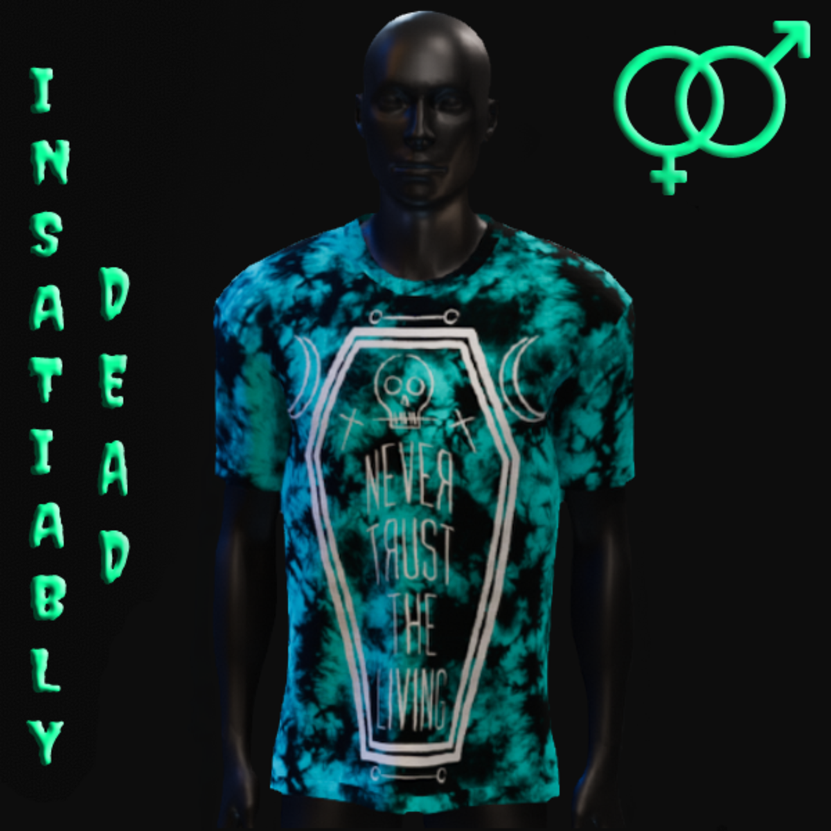 FOR ALL THE GHOULS AND GALS. UNISEX "NEVER TRUST THE LIVING" T-SHIRT DARK TIE DYE [BLACK/AQUA]. CREATED IN MARVELOUS DESIGNER WITH AVATAR 2.0. ADJUSTMENT MAY BE REQUIRED! FITTING INSTRUCTIONS CAN BE FOUND BY GOING TO THE LINK BELOW. https://help.sansar.com/hc/en-us/articles/115005693363-Fitting-Marvelous-Designer-clothing-to-your-avatar PLEASE RATE AFTER BUYING! IF ANY ISSUES OCCUR PLEASE CONTACT TEAGAN BROKKEN FOR ASSISTANCE. THANK YOU! <3 <3 GET INSATIABLY DEAD <3