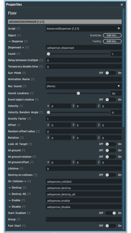 This dispenser allows you to rez an object around a target. The target can be the object this script is in, or from the event's object / user. The script also has a "Gun Mode" where it will listen to Trigger presses when grabbed and rez bullets, with click throttling, sound effect. This saves you from doing the same with 5 or so simple scripts, and does not rely on events! So multiple rezzers can be added to the scene or sold without reconfiguring. This is useful for rezzing huds, followers, guns, bullets, or anything else you need to rez next to the user or object. The dispenser allows: - Rezzing a variety of objects, each with their own event. - Velocity and random offset at rez - Sound effect on rez - Multiple rezzes over time - Rez at ground - Rez looking at target - Random position around target - Object lifetime - Derez on collision - Set target from the event's object/user https://gyazo.com/0268bdbb743c59efc8ad98f6f37921f3 Changelog: 1.0.0 - Initial release 1.1.0 - Fixed velocity to be relative to objects rotation. added 'Dispensed ->' event for each time the object is dispensed. 1.2.0 - renamed script to 'Advanced Dispenser', added support for multiple objects to rez from different events, added 'Gun Mode', sound effect, and random velocity angle offset to simulate shooting inaccuracy. 1.2.1 - added rez animation, gravity factor, and destroy callback * I allow buyers to resell this script as part of their own products, but not as a standalone script