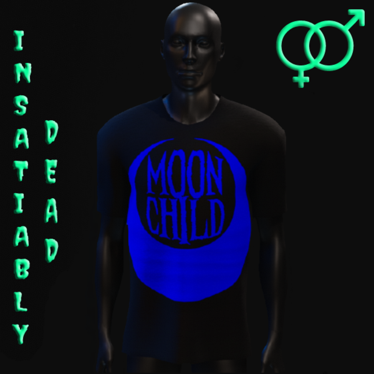 FOR ALL THE GHOULS AND GALS. UNISEX "MOON CHILD" T-SHIRT [BLACK/BLUE]. CREATED IN MARVELOUS DESIGNER WITH AVATAR 2.0. ADJUSTMENT MAY BE REQUIRED! FITTING INSTRUCTIONS CAN BE FOUND BY GOING TO THE LINK BELOW. https://help.sansar.com/hc/en-us/articles/115005693363-Fitting-Marvelous-Designer-clothing-to-your-avatar PLEASE RATE AFTER BUYING! IF ANY ISSUES OCCUR PLEASE CONTACT TEAGAN BROKKEN FOR ASSISTANCE. THANK YOU! <3 <3 GET INSATIABLY DEAD <3