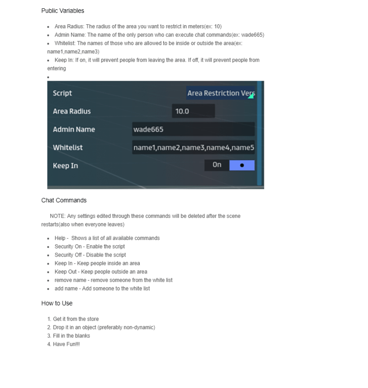 Prevents everyone except those on the white list in your scene from entering or leaving an specific area. Please read https://help.sansar.com/hc/en-us/community/posts/115018659363-Area-Restriction-Script or refer to the last image for more information