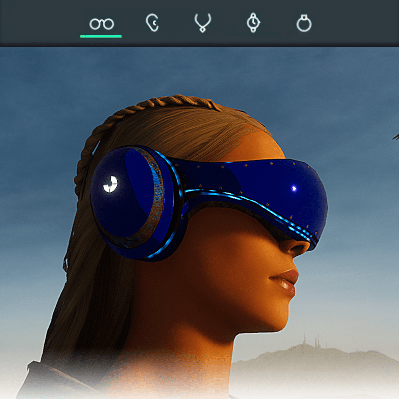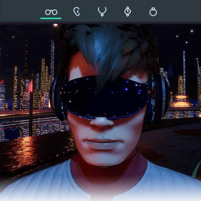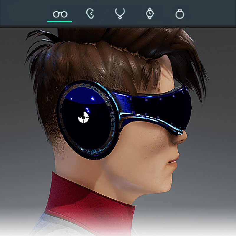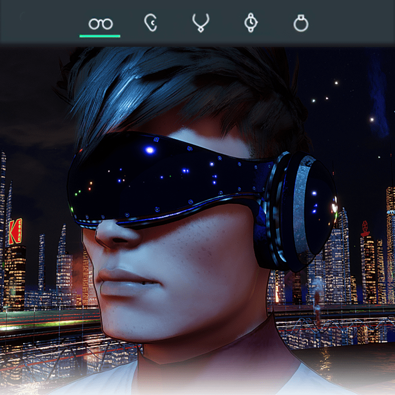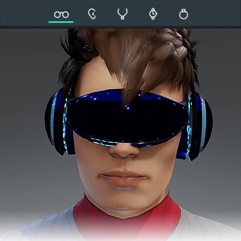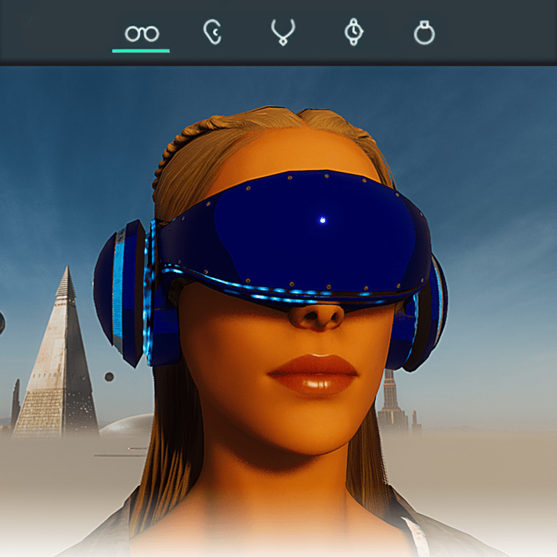 Visionary Design for a VR Headset exclusive for Sansar Metaverse. This Vr Glasses don't mess the Hair of your Avatar. Minimal and Elegant Design. Vr Glasses with HeadPhone. Chrome Texture. Animated Light Inside. Unisex. Match with all humanoids avatars. No need adjustments for Default 2.0 Avatar of Sansar.