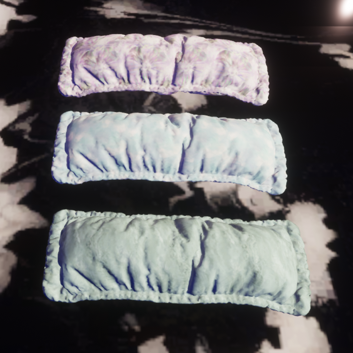 Pastel pink, blue, blue/green pillows. Smooth texture