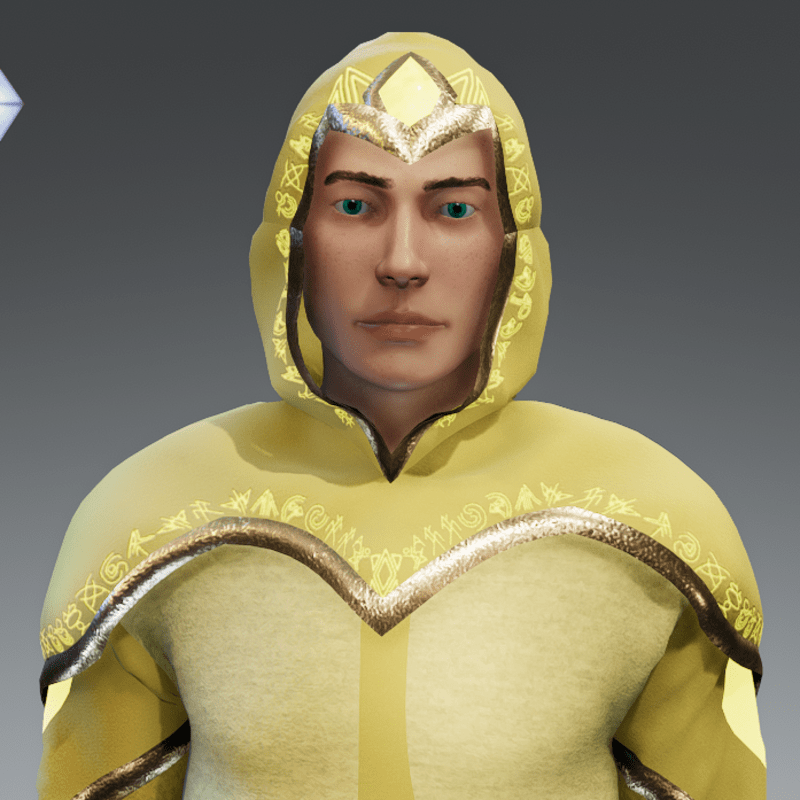 Rich Sulfur coloured robes with golden trims, two large glowing Sulfur gems set in the hood and belt. To top it all off, patiently crafted original runic alphabet lining the hood and sleeves that is luminous and animated with a pulse that fades in and out of visibility. The enchanted gemstones also glow in the same manner as the runes. Fitted to the default male avatar 2.0. A very magical garment perfect for any aspiring wizard or mage, can be used for role-play or just as a fancy outfit for a party.