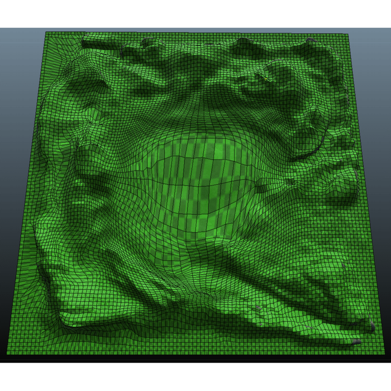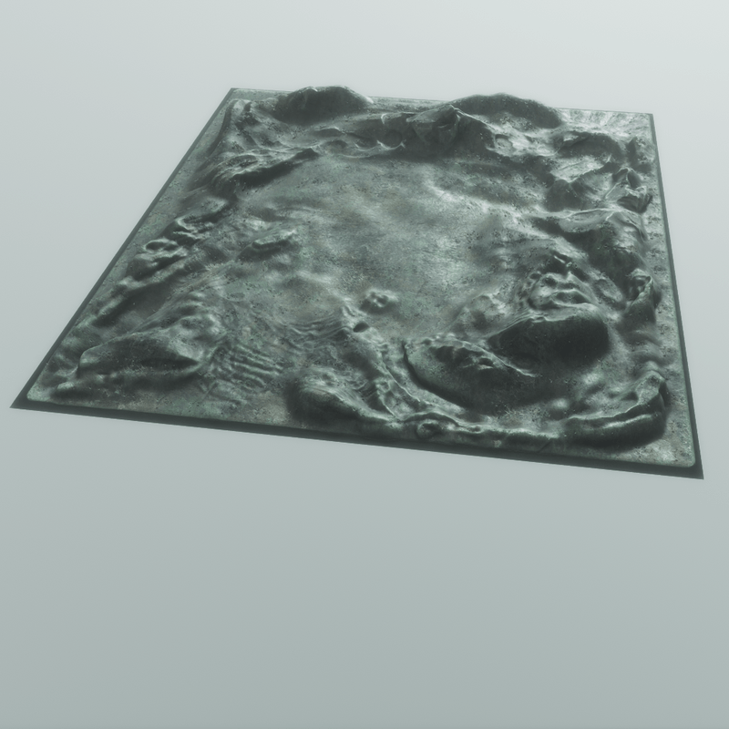 18432 triangles This is meant as a larger scenery in the center of which you place a smaller terrain and water. Texture is surreal, as of bronze colour. You should be able to replace the texture with the help of the ambient occlusion map included here.