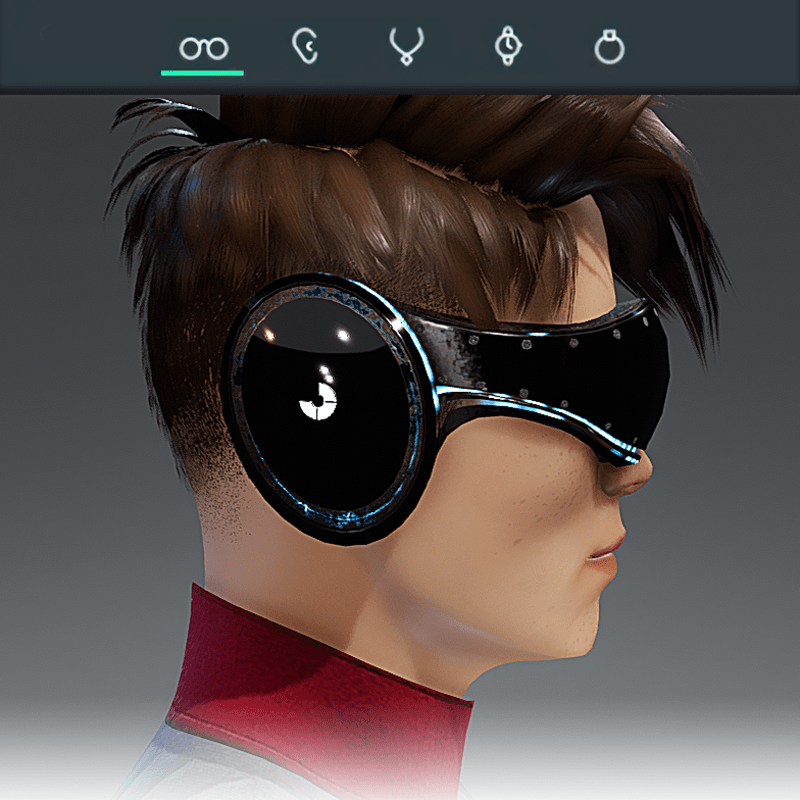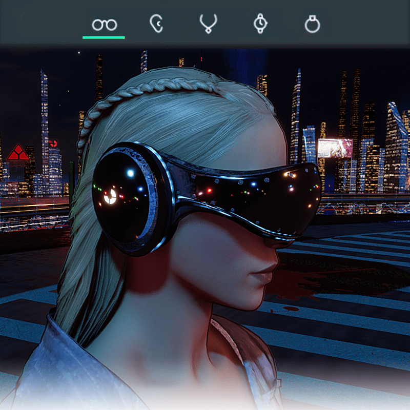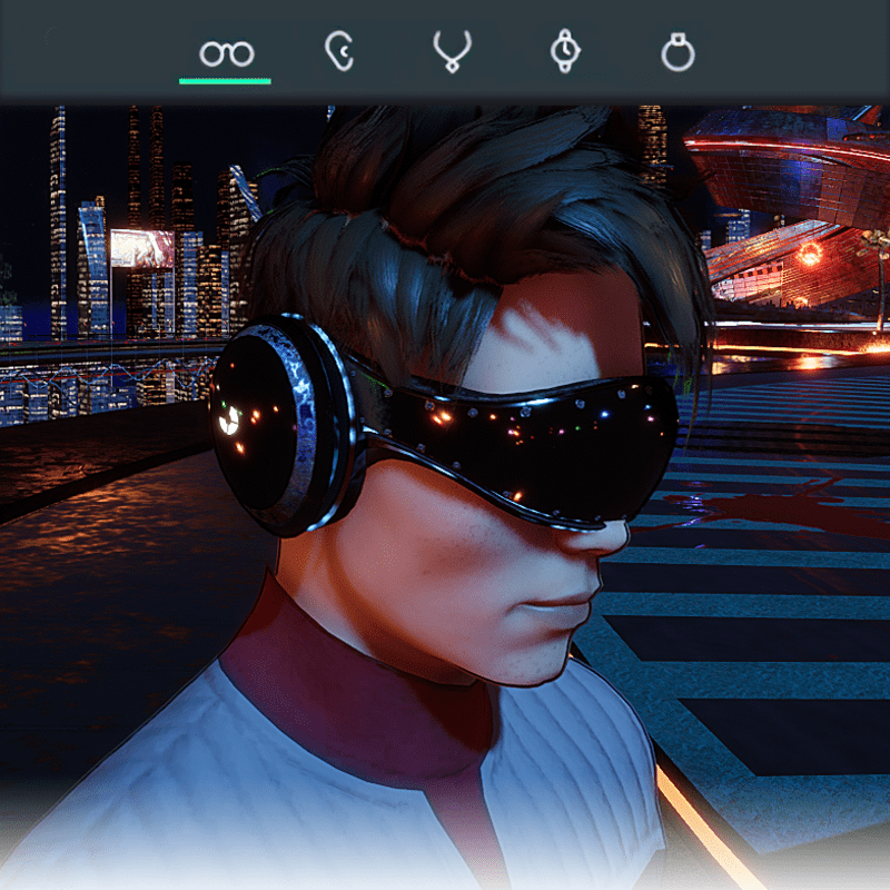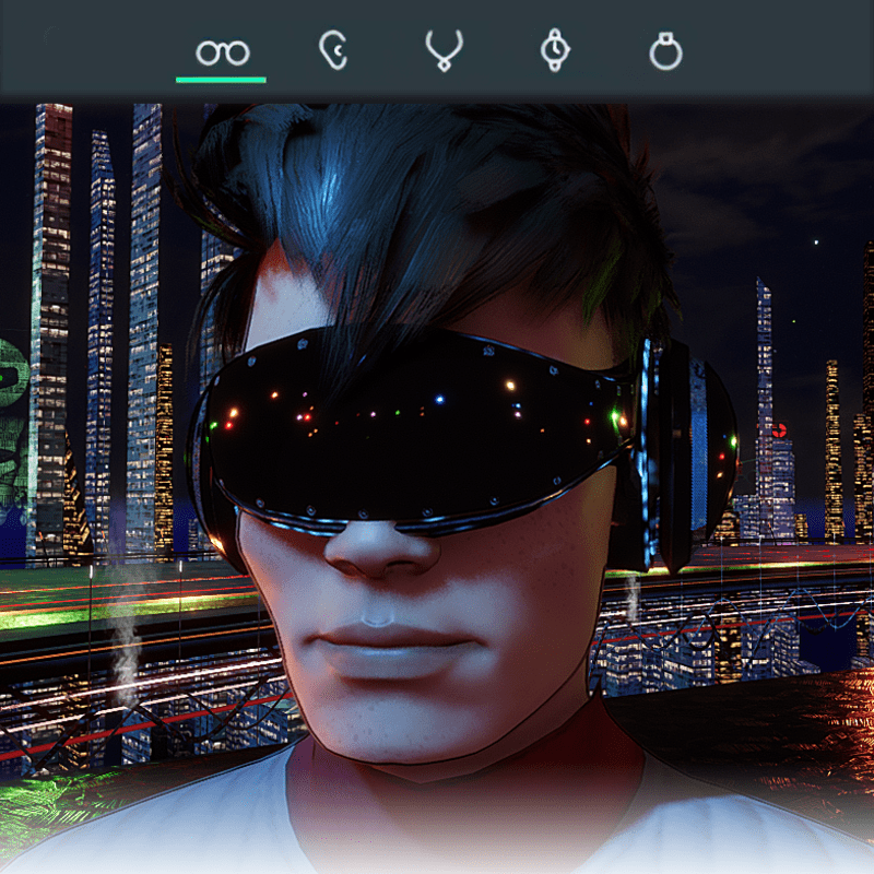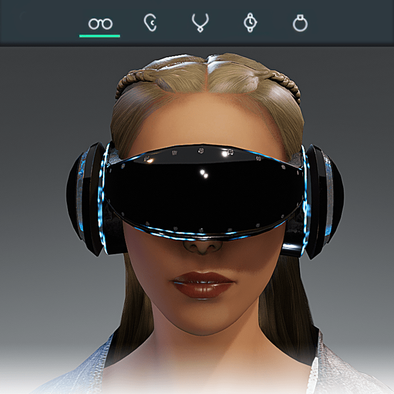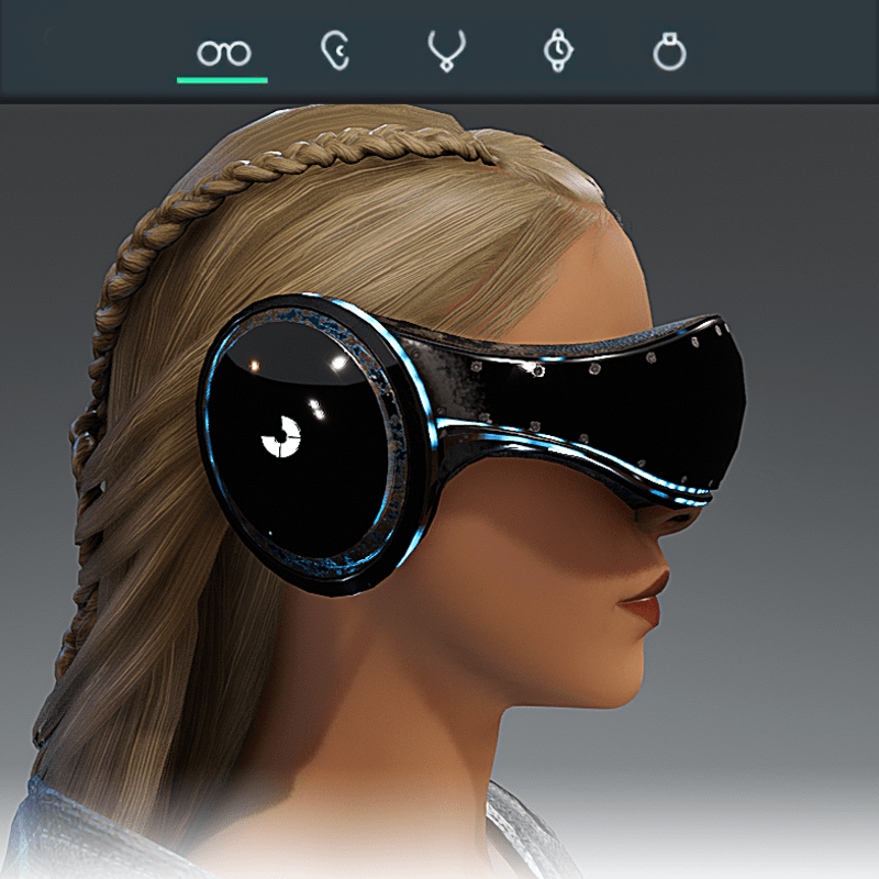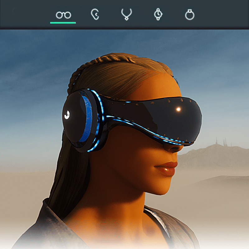 Visionary Design for a VR Headset exclusive for Sansar Metaverse. This Vr Glasses don't mess the Hair of your Avatar. Minimal and Elegant Design. Vr Glasses with HeadPhone. Chrome Texture. Animated Light Inside. Unisex. Match with all humanoids avatars. No need adjustments for Default 2.0 Avatar of Sansar.