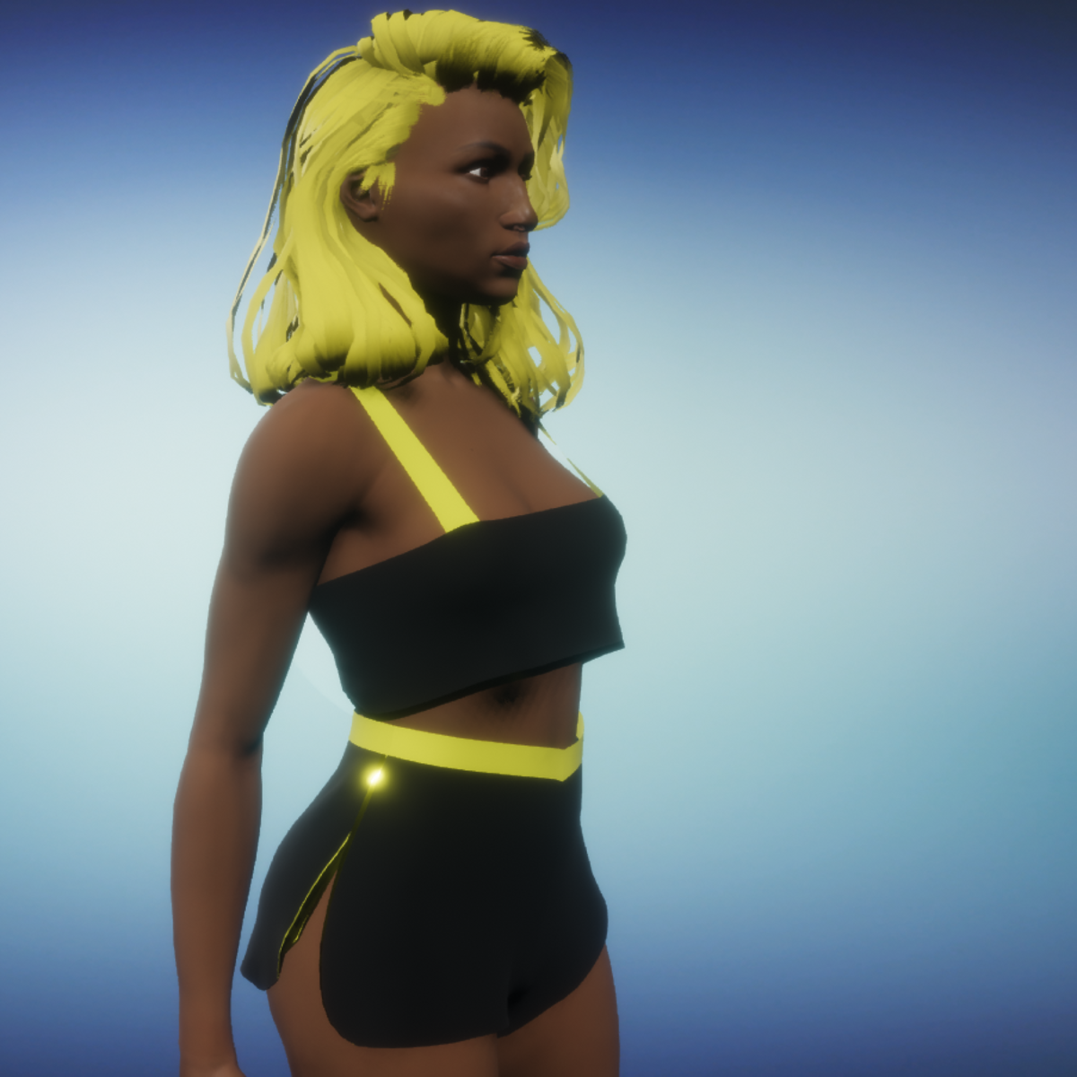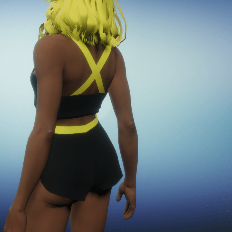 Bland and Yellow top and bottom short set. To wear: Click the item in your inventory Click 'adjust' Wait for item to adjusy The clothing will move into place. DON'T click the item unless you want to change the look of your clothing placement (example: taking a strap off the shoulder). If the item gets too out of place, remove the item and start again.