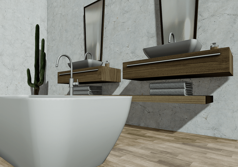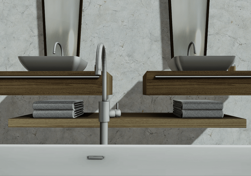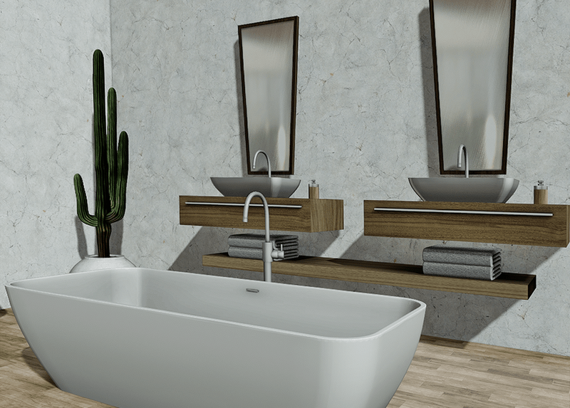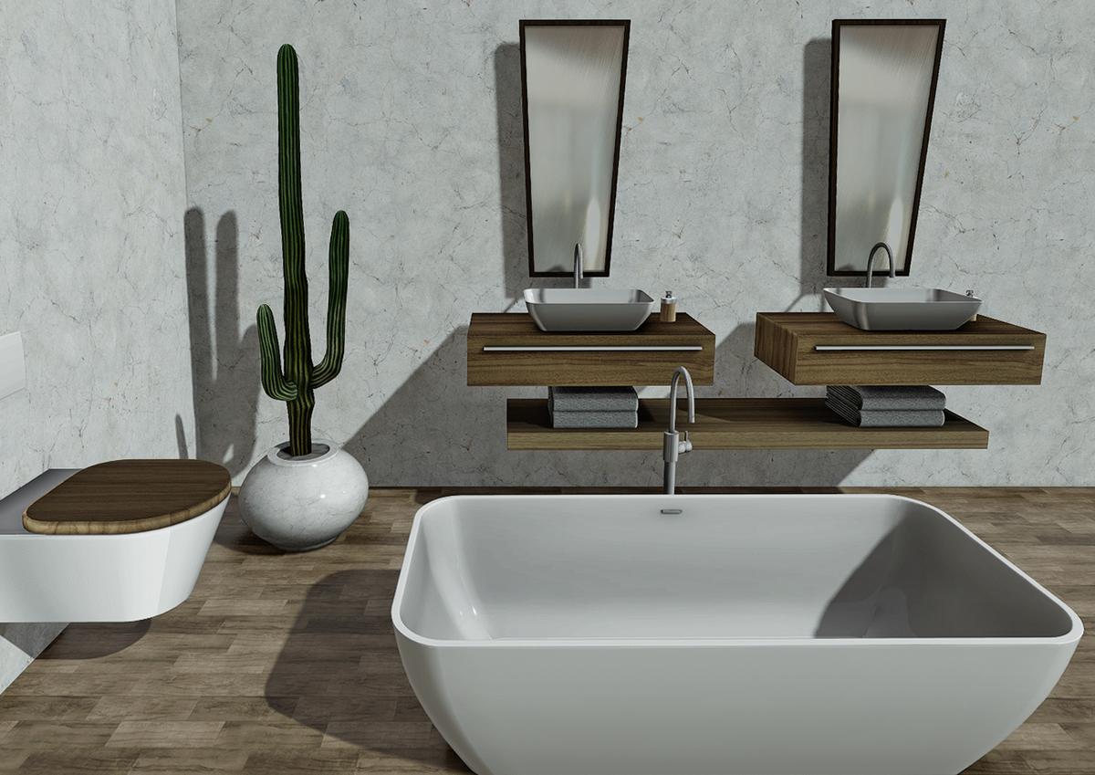Contemporary bathroom with freestanding bathtub, double bathroom vanity with mirrors and accessories, and toilet seat. Collision mesh, non-scripted. It can be seen here: https://atlas.sansar.com/experiences/jasminaweezles/darma
