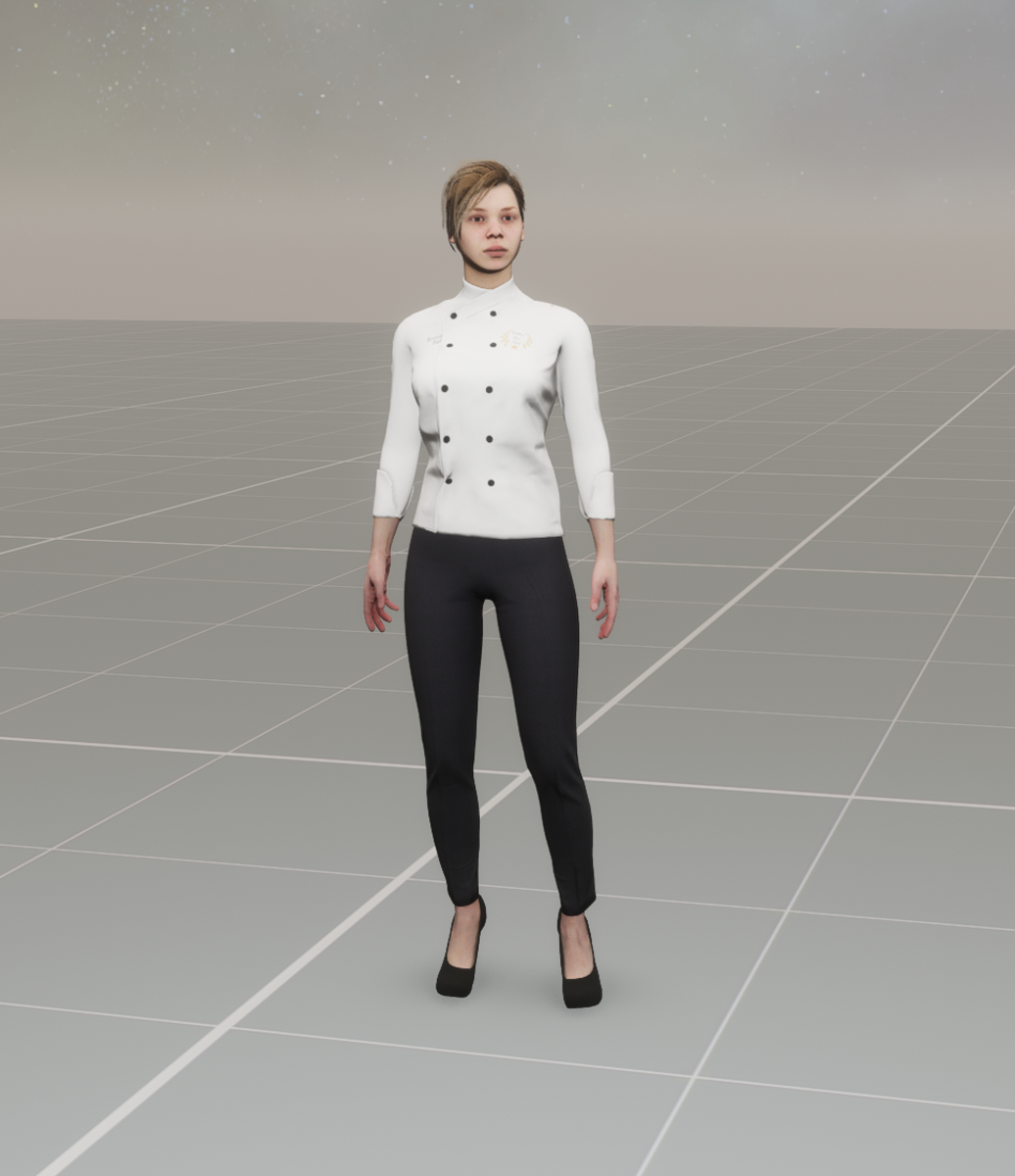 NPC. Hospitality worker. I use it for different things. Pretty versatile. I resized the textures and modified the shader. Idle animation Used in the Linwood world. See it 'in person' at Lando's Mini Mall https://atlas.sansar.com/experiences/lando/lando-s-freebies