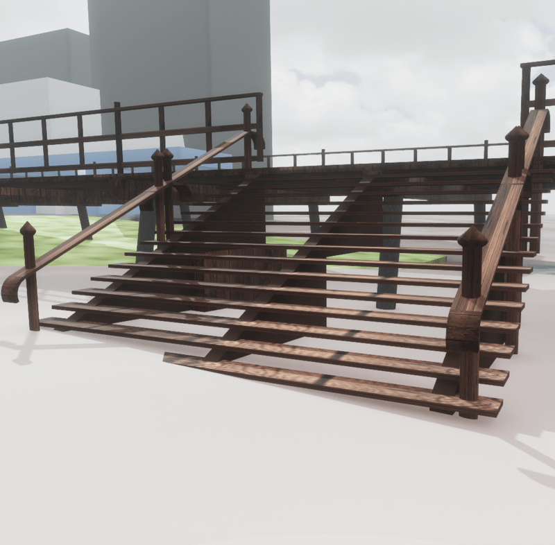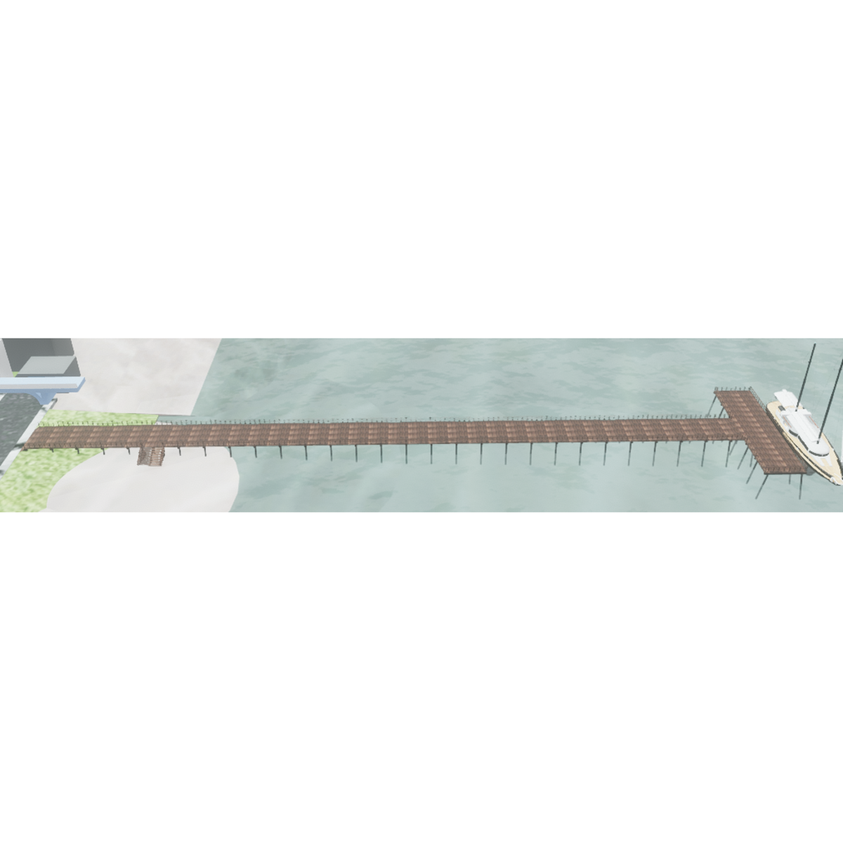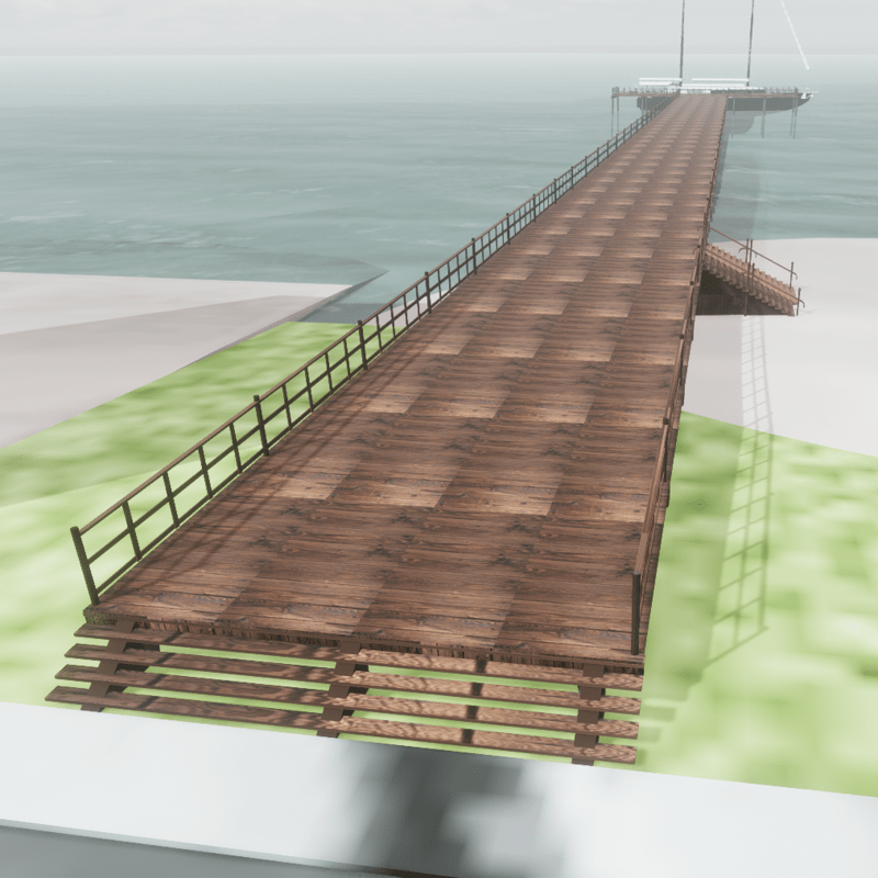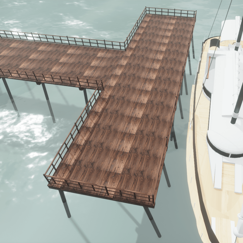 492.1' (150 m) long x 26.2' (8 m) wide (98.4' or 30 m at the end), enough space for build an amusement park on it Piles are long enough to be buried on the beach and seabed The ship is not included